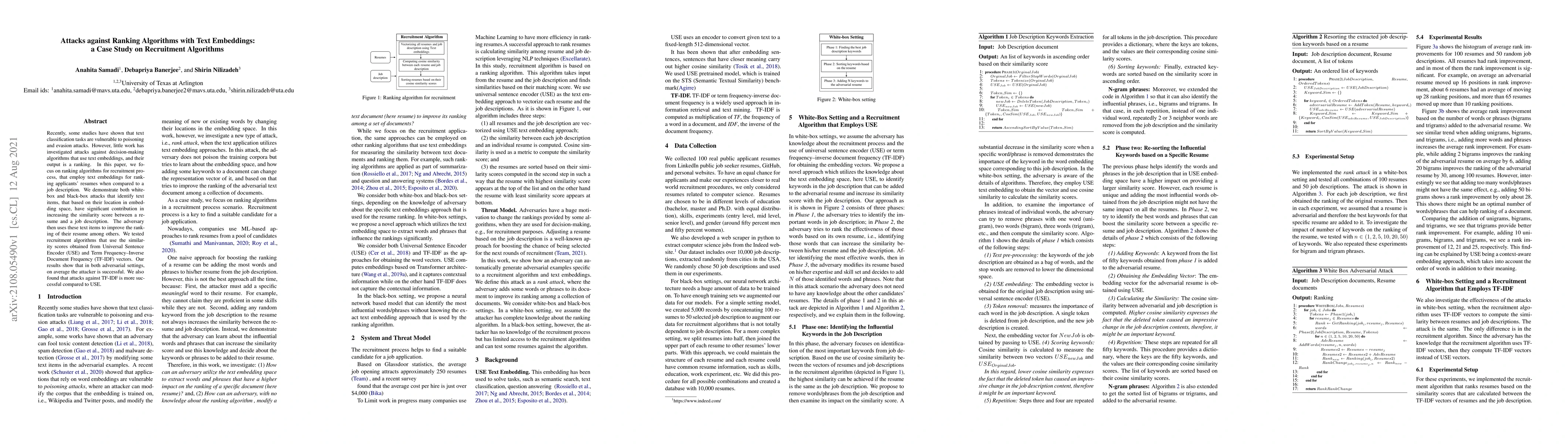 Recently, some studies have shown that text classification tasks are vulnerable to poisoning and evasion attacks. However, little work has investigated attacks against decision making algorithms that use text embeddings, and their output is a ranking. In this paper, we focus on ranking algorithms for recruitment process, that employ text embeddings for ranking applicants resumes when compared to a job description. We demonstrate both white box and black box attacks that identify text items, that based on their location in embedding space, have significant contribution in increasing the similarity score between a resume and a job description. The adversary then uses these text items to improve the ranking of their resume among others. We tested recruitment algorithms that use the similarity scores obtained from Universal Sentence Encoder (USE) and Term Frequency Inverse Document Frequency (TF IDF) vectors. Our results show that in both adversarial settings, on average the attacker is successful. We also found that attacks against TF IDF is more successful compared to USE.