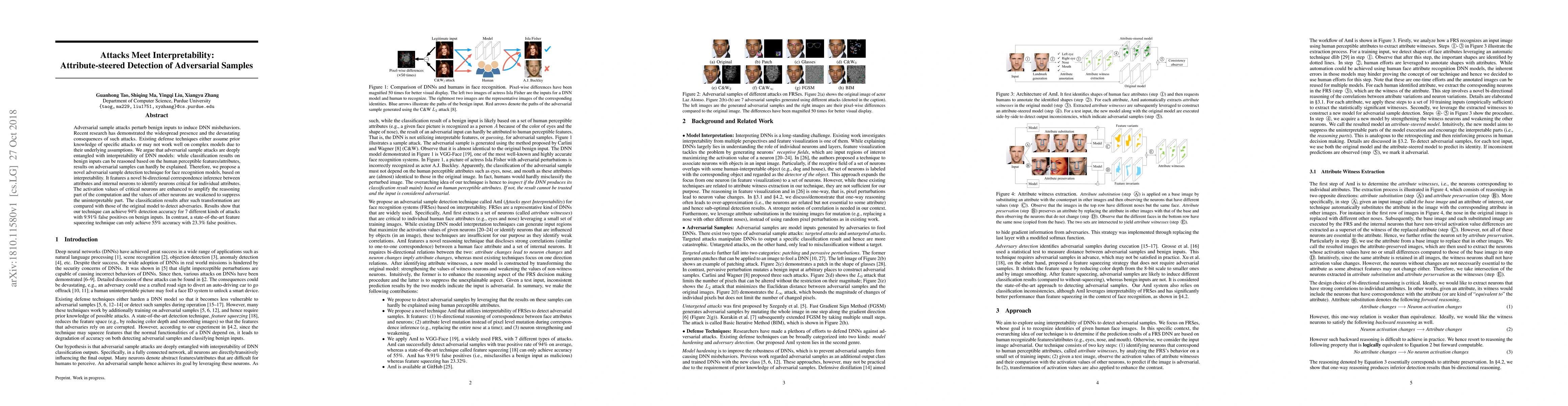 Adversarial sample attacks perturb benign inputs to induce DNN misbehaviors. Recent research has demonstrated the widespread presence and the devastating consequences of such attacks. Existing defense techniques either assume prior knowledge of specific attacks or may not work well on complex models due to their underlying assumptions. We argue that adversarial sample attacks are deeply entangled with interpretability of DNN models: while classification results on benign inputs can be reasoned based on the human perceptible features/attributes, results on adversarial samples can hardly be explained. Therefore, we propose a novel adversarial sample detection technique for face recognition models, based on interpretability. It features a novel bi-directional correspondence inference between attributes and internal neurons to identify neurons critical for individual attributes. The activation values of critical neurons are enhanced to amplify the reasoning part of the computation and the values of other neurons are weakened to suppress the uninterpretable part. The classification results after such transformation are compared with those of the original model to detect adversaries. Results show that our technique can achieve 94% detection accuracy for 7 different kinds of attacks with 9.91% false positives on benign inputs. In contrast, a state-of-the-art feature squeezing technique can only achieve 55% accuracy with 23.3% false positives.