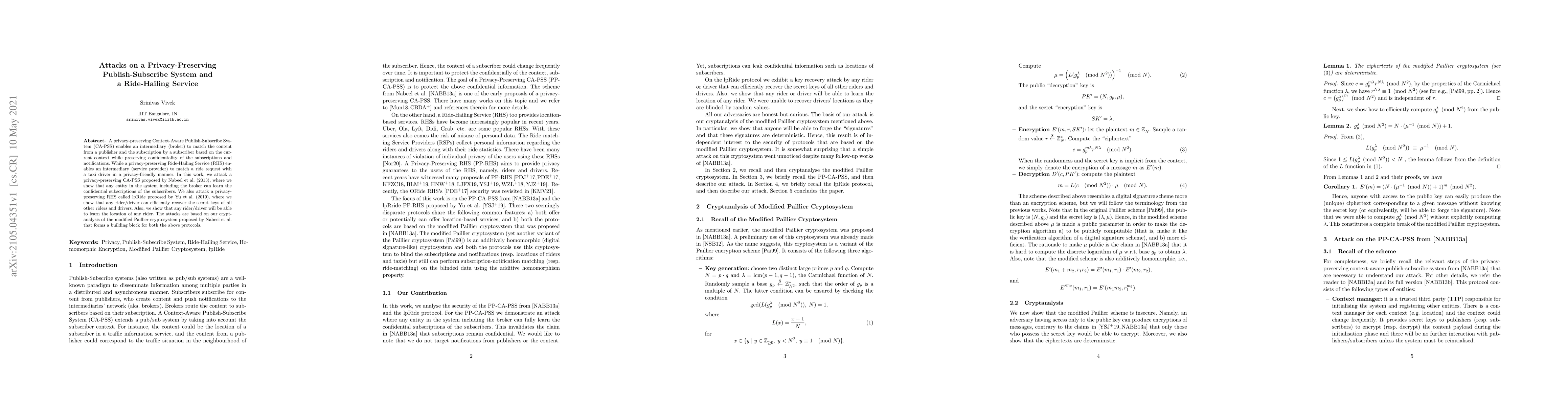 This research identifies vulnerabilities in two privacy systems: a Context-Aware Publish-Subscribe System (CA-PSS) and a Ride-Hailing Service (RHS). The attacks exploit flaws in a modified Paillier cryptosystem, revealing confidential subscriptions in CA-PSS and enabling secret key recovery and location tracking in RHS, challenging their privacy guarantees.