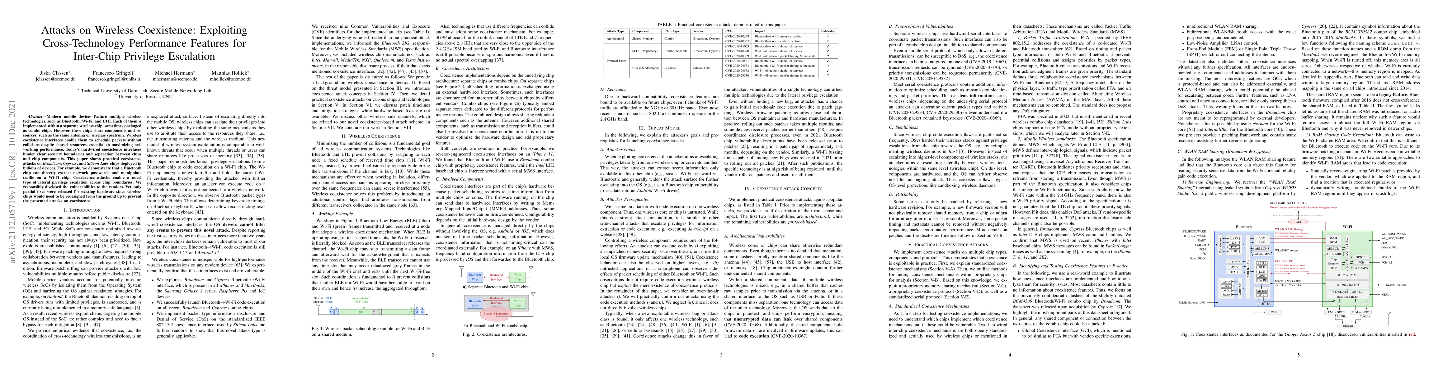 This paper reveals practical attacks exploiting wireless coexistence interfaces in mobile devices, allowing a Bluetooth chip to extract network passwords and manipulate Wi-Fi traffic, demonstrating a new form of inter-chip privilege escalation. Vendors were notified, but only partial fixes were implemented due to the need for a complete redesign of wireless chips.