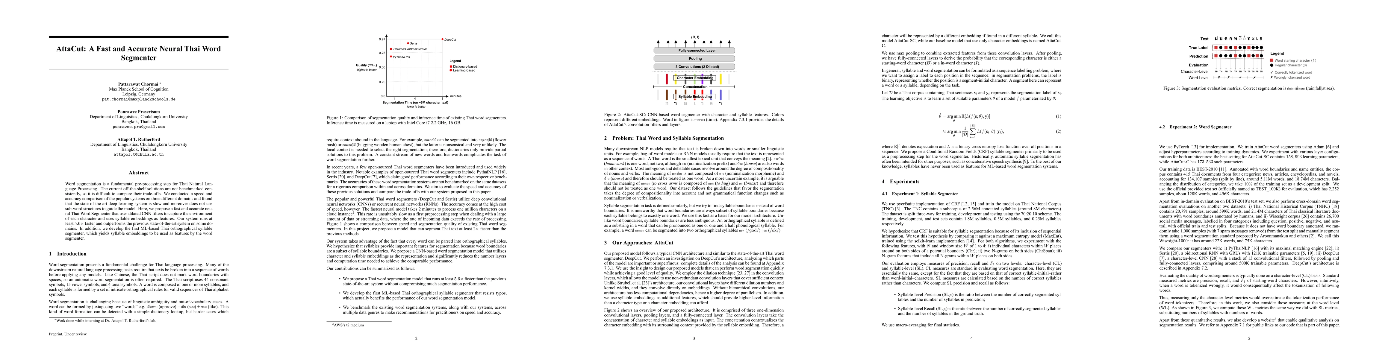 The paper proposes AttaCut, a fast and accurate neural Thai word segmenter that leverages dilated CNN filters and syllable embeddings, achieving at least 5.6x faster performance and outperforming previous systems on certain domains, while also introducing a novel ML-based Thai orthographical syllable segmenter.