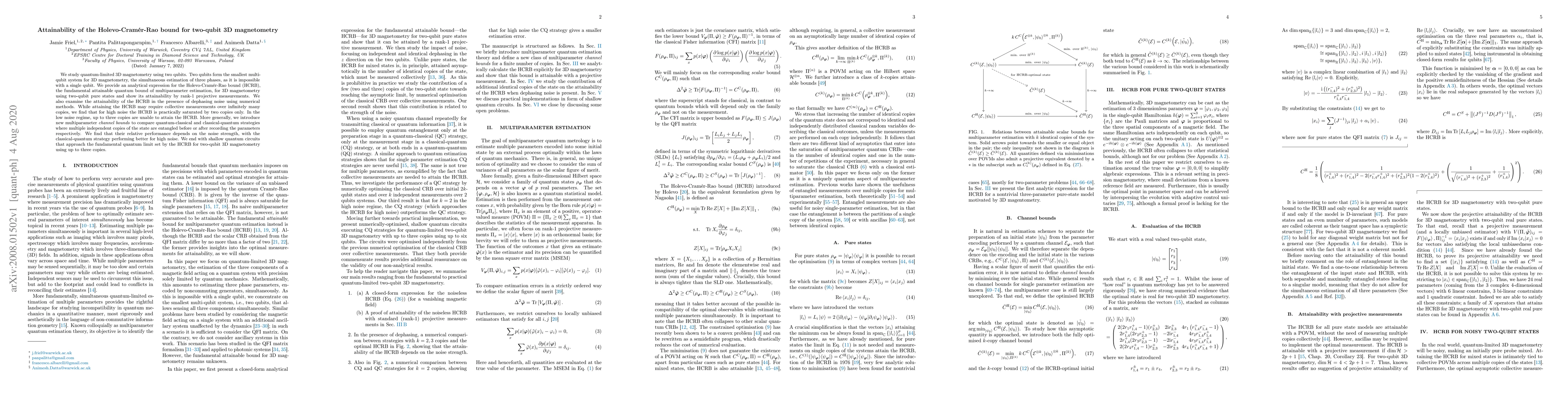 This paper investigates quantum-limited 3D magnetometry using two qubits, providing an analytical expression for the Holevo-Cramér-Rao bound (HCRB) and demonstrating its attainability through rank-1 projective measurements. It also explores the HCRB's attainability under dephasing noise, finding that high noise allows practical saturation with just two copies, while low noise requires more copies.