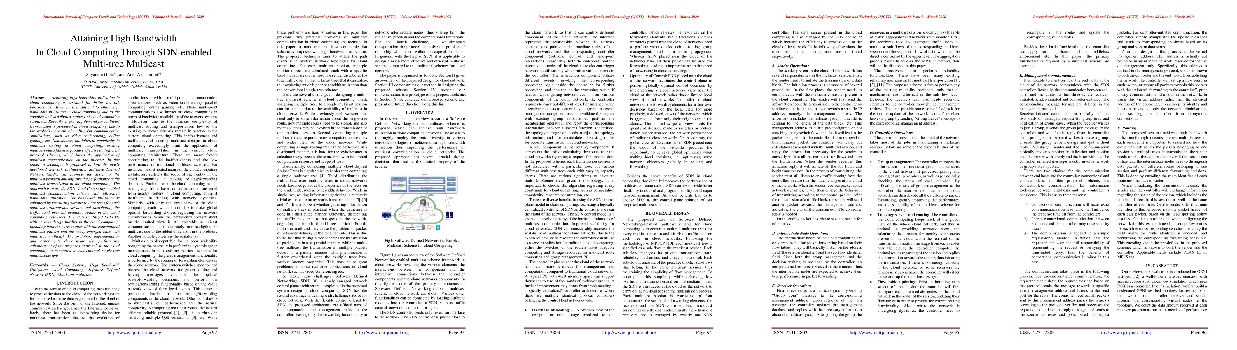 Achieving high bandwidth utilization in cloud computing is essential for better network performance. However, it is difficult to attain high bandwidth utilization in cloud computing due to the complex and distributed natures of cloud computing resources. Recently, a growing demand for multicast transmission is perceived in cloud computing, due to the explosive growth of multi-point communication applications, such as video conferencing, online gaming, etc. Nonetheless, the inherent complexity in multicast routing in cloud computing, existing multicast plans failed to produce effective and efficient protocol schemes, which limits the application of multicast communication on the Internet. In this paper, a technique is proposed in how the newly developed network architecture, Software Defined Network (SDN), can promote the design of the multicast protocol and improve the performance of the multicast transmission in the cloud computing. The approach is to use the SDN-cloud Computing-enabled multicast communication scheme with ultra-high bandwidth utilization. The bandwidth utilization is enhanced by measuring various routing trees for each multicast transmission session and distributing the traffic load over all available routes in the cloud computing resources. The SDN is utilized to tackle with various design hurdles in the cloud computing, including both the current ones with the conventional multicast pattern and the newly emerged ones with multi-tree multicast. The prototype implementation and experiments demonstrate the performance enhancement of the proposed approach in the cloud computing in compared to conventional single-tree multicast designs.
