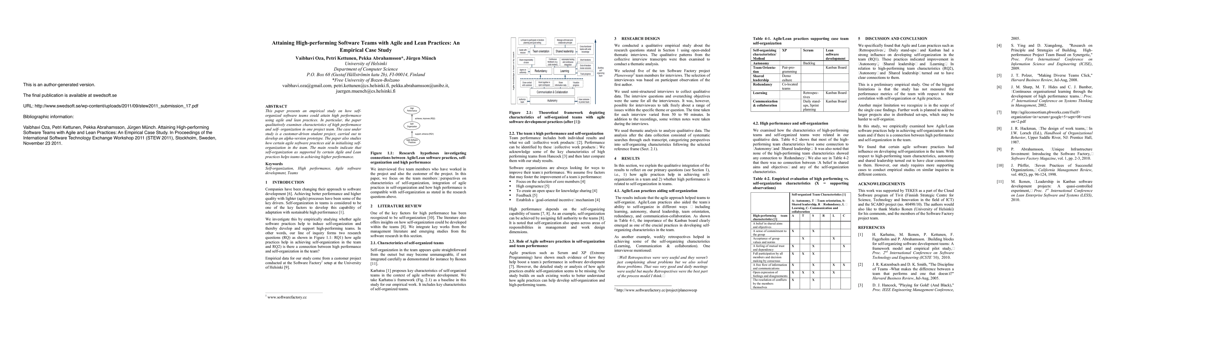 This paper investigates how self-organized software teams achieve high performance using agile and lean practices through a qualitative case study of a student project. The findings suggest that specific agile practices facilitate the initiation of self-organization, leading to enhanced team performance.