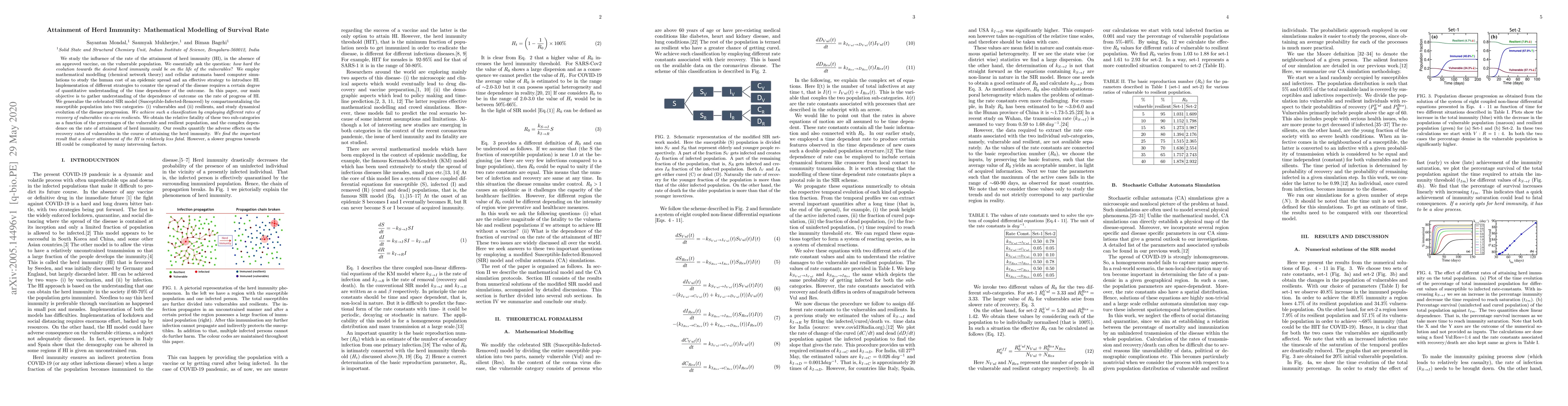 We study the influence of the rate of the attainment of herd immunity (HI), in the absence of an approved vaccine, on the vulnerable population. We essentially ask the question: how hard the evolution towards the desired herd immunity could be on the life of the vulnerables? We employ mathematical modelling (chemical network theory) and cellular automata based computer simulations to study the human cost of an epidemic spread and an effective strategy to introduce HI. Implementation of different strategies to counter the spread of the disease requires a certain degree of quantitative understanding of the time dependence of the outcome. In this paper, our main objective is to gather understanding of the dependence of outcome on the rate of progress of HI. We generalize the celebrated SIR model (Susceptible-Infected-Removed) by compartmentalizing the susceptible population into two categories- (i) vulnerables and (ii) resilients, and study dynamical evolution of the disease progression. We achieve such a classification by employing different rates of recovery of vulnerables vis-a-vis resilients. We obtain the relative fatality of these two sub-categories as a function of the percentages of the vulnerable and resilient population, and the complex dependence on the rate of attainment of herd immunity. Our results quantify the adverse effects on the recovery rates of vulnerables in the course of attaining the herd immunity. We find the important result that a slower attainment of the HI is relatively less fatal. However, a slower progress towards HI could be complicated by many intervening factors.