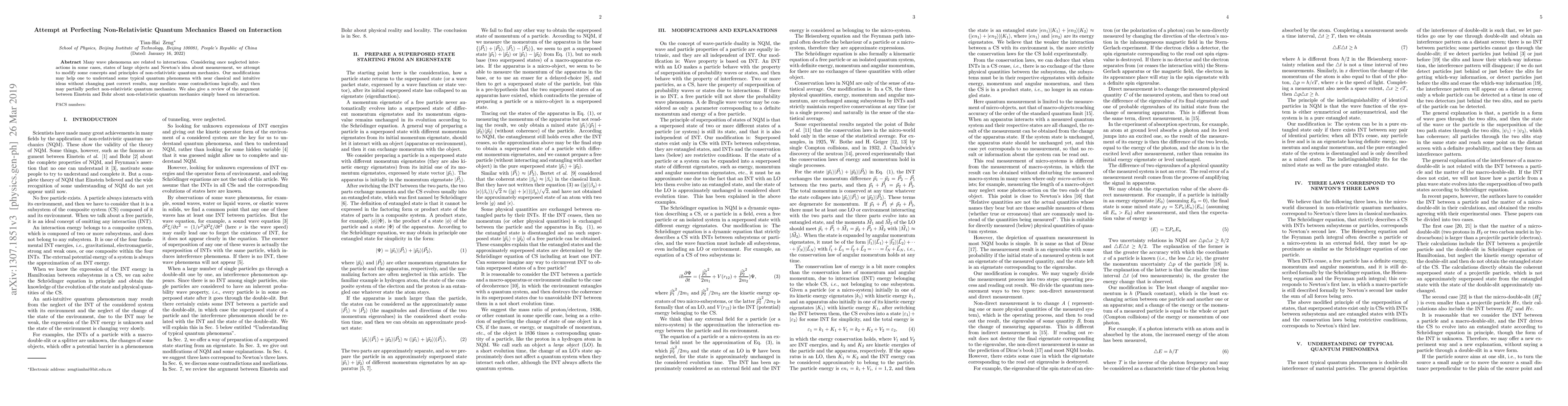 This paper proposes modifications to non-relativistic quantum mechanics by considering previously neglected interactions to enhance understanding of typical quantum phenomena with more intuitive concepts, aiming to resolve some contradictions while preserving past correct results. The paper also reviews the Einstein-Bohr debate on quantum mechanics through the lens of interaction.