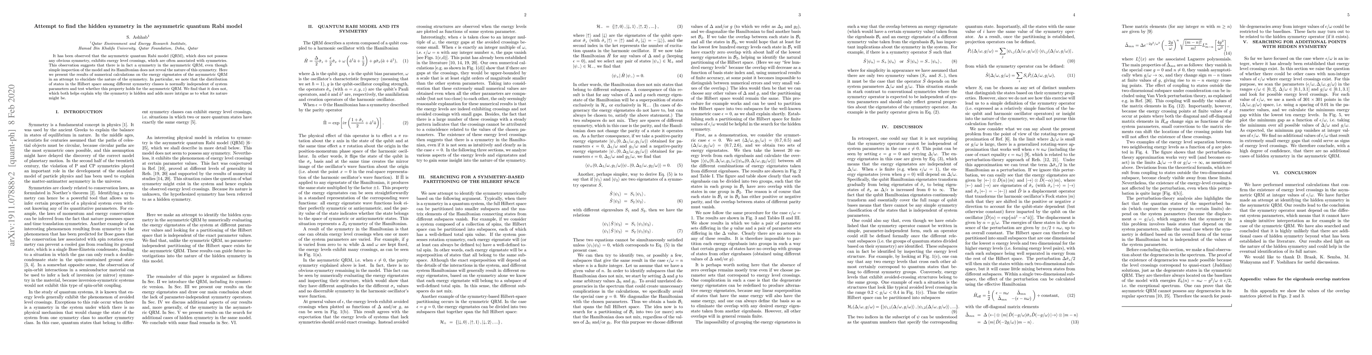 It has been observed that the asymmetric quantum Rabi model (QRM), which does not possess any obvious symmetry, exhibits energy level crossings, which are often associated with symmetries. This observation suggests that there is in fact a symmetry in the asymmetric QRM, even though simple inspection of the model and its Hamiltonian does not reveal the nature of this symmetry. Here we present the results of numerical calculations on the energy eigenstates of the asymmetric QRM in an attempt to elucidate the nature of the symmetry. In particular, we note that the distribution of states in the Hilbert space among different symmetry classes is normally independent of system parameters and test whether this property holds for the asymmetric QRM. We find that it does not, which both helps explain why the symmetry is hidden and adds more intrigue as to what its nature might be.