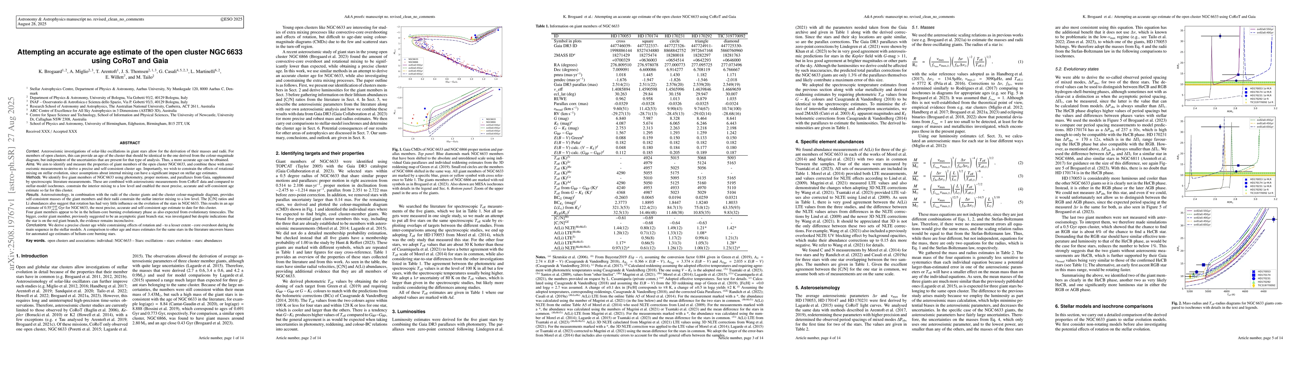 Asteroseismology of solar-like oscillations in giant stars allow the derivation of their masses and radii. For members of open clusters, this provides an age of the cluster that should be identical to the one derived from the colour-magnitude diagram, but independent of the uncertainties that are present for that type of analysis. We aim to identify and measure the properties of giant members of the open cluster NGC6633, and combine these with asteroseismic measurements to derive a precise and self-consistent cluster age. Importantly, we wish to constrain the effects of rotational mixing on stellar evolution, since assumptions about internal mixing can have a significant impact on stellar age estimates. We identify five giant members of NGC6633 using photometry and Gaia data, supplemented by spectroscopic literature measurements. These are combined with asteroseismic measurements from CoRoT data and compared to stellar-model isochrones. This constrains the interior mixing to a low level and enables the most precise, accurate and self-consistent age estimate so far for this cluster. Asteroseismology of the giants and the cluster colour-magnitude diagram provide self-consistent masses of the giant members and their radii constrain the stellar interior mixing to a low level. The [C/N] ratios and Li abundances also suggest that rotation has had very little influence on the evolution of the stars in NGC 6633. This results in an age estimate of 0.55+0.05-0.10 Gyr for NGC6633. Four giant members appear to be in the helium-core burning evolutionary phase as also expected from evolutionary timescales. For the largest giant, the evidence remains inconclusive. A comparison to other age and mass estimates for the same stars in the literature uncovers biases for automated age estimates of helium-core burning stars.