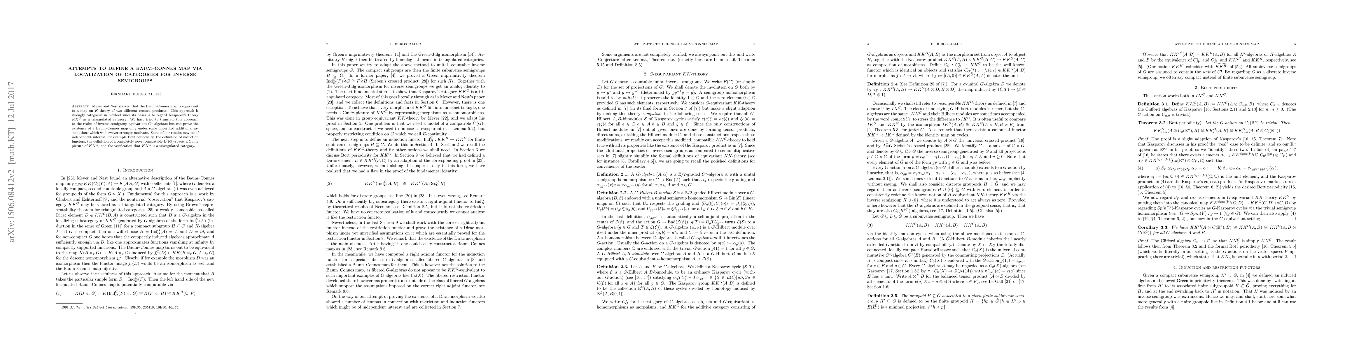 This paper explores translating the Baum--Connes map's definition from group to inverse semigroup settings via localization of categories, achieving partial results under unverified assumptions. Key findings include Bott periodicity, induction functors, a new $L^2(G)$-space, and a Cuntz picture of $KK^G$.
