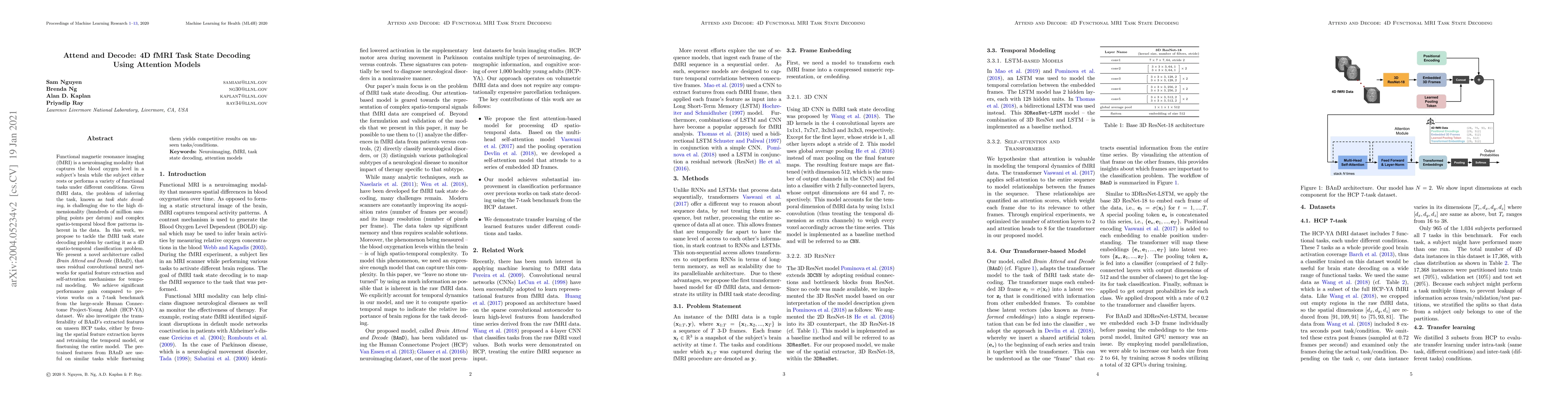 Functional magnetic resonance imaging (fMRI) is a neuroimaging modality that captures the blood oxygen level in a subject's brain while the subject either rests or performs a variety of functional tasks under different conditions. Given fMRI data, the problem of inferring the task, known as task state decoding, is challenging due to the high dimensionality (hundreds of million sampling points per datum) and complex spatio-temporal blood flow patterns inherent in the data. In this work, we propose to tackle the fMRI task state decoding problem by casting it as a 4D spatio-temporal classification problem. We present a novel architecture called Brain Attend and Decode (BAnD), that uses residual convolutional neural networks for spatial feature extraction and self-attention mechanisms for temporal modeling. We achieve significant performance gain compared to previous works on a 7-task benchmark from the large-scale Human Connectome Project-Young Adult (HCP-YA) dataset. We also investigate the transferability of BAnD's extracted features on unseen HCP tasks, either by freezing the spatial feature extraction layers and retraining the temporal model, or finetuning the entire model. The pre-trained features from BAnD are useful on similar tasks while finetuning them yields competitive results on unseen tasks/conditions.