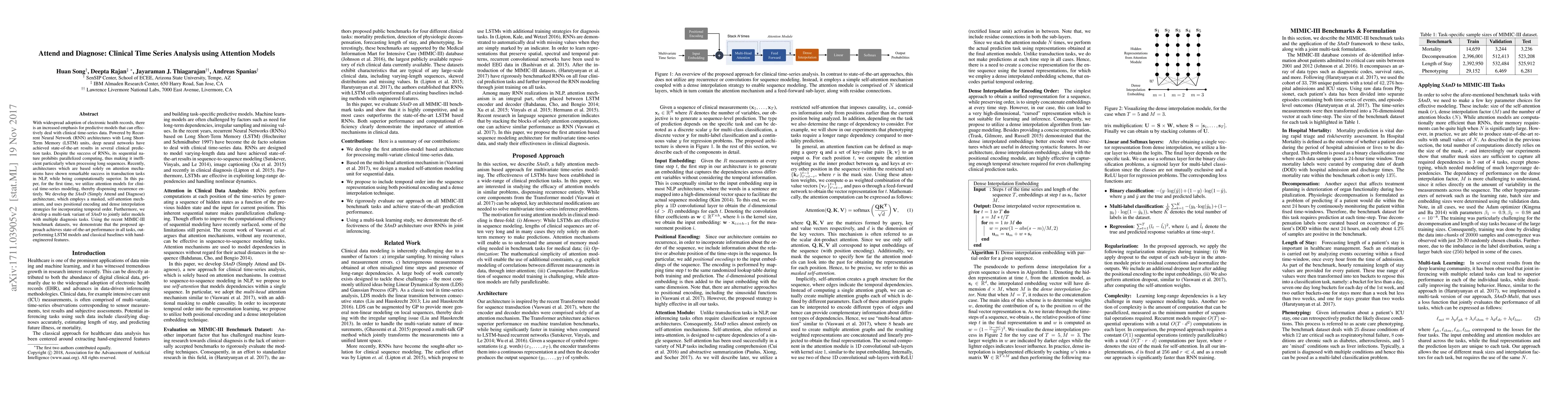 With widespread adoption of electronic health records, there is an increased emphasis for predictive models that can effectively deal with clinical time-series data. Powered by Recurrent Neural Network (RNN) architectures with Long Short-Term Memory (LSTM) units, deep neural networks have achieved state-of-the-art results in several clinical prediction tasks. Despite the success of RNNs, its sequential nature prohibits parallelized computing, thus making it inefficient particularly when processing long sequences. Recently, architectures which are based solely on attention mechanisms have shown remarkable success in transduction tasks in NLP, while being computationally superior. In this paper, for the first time, we utilize attention models for clinical time-series modeling, thereby dispensing recurrence entirely. We develop the \textit{SAnD} (Simply Attend and Diagnose) architecture, which employs a masked, self-attention mechanism, and uses positional encoding and dense interpolation strategies for incorporating temporal order. Furthermore, we develop a multi-task variant of \textit{SAnD} to jointly infer models with multiple diagnosis tasks. Using the recent MIMIC-III benchmark datasets, we demonstrate that the proposed approach achieves state-of-the-art performance in all tasks, outperforming LSTM models and classical baselines with hand-engineered features.