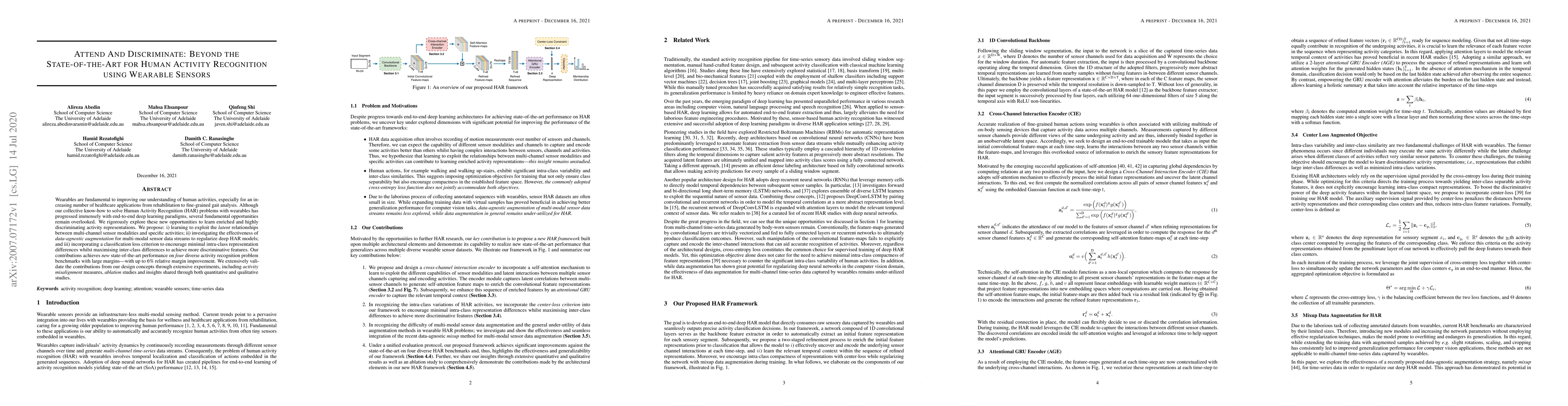 Wearables are fundamental to improving our understanding of human activities, especially for an increasing number of healthcare applications from rehabilitation to fine-grained gait analysis. Although our collective know-how to solve Human Activity Recognition (HAR) problems with wearables has progressed immensely with end-to-end deep learning paradigms, several fundamental opportunities remain overlooked. We rigorously explore these new opportunities to learn enriched and highly discriminating activity representations. We propose: i) learning to exploit the latent relationships between multi-channel sensor modalities and specific activities; ii) investigating the effectiveness of data-agnostic augmentation for multi-modal sensor data streams to regularize deep HAR models; and iii) incorporating a classification loss criterion to encourage minimal intra-class representation differences whilst maximising inter-class differences to achieve more discriminative features. Our contributions achieves new state-of-the-art performance on four diverse activity recognition problem benchmarks with large margins -- with up to 6% relative margin improvement. We extensively validate the contributions from our design concepts through extensive experiments, including activity misalignment measures, ablation studies and insights shared through both quantitative and qualitative studies.