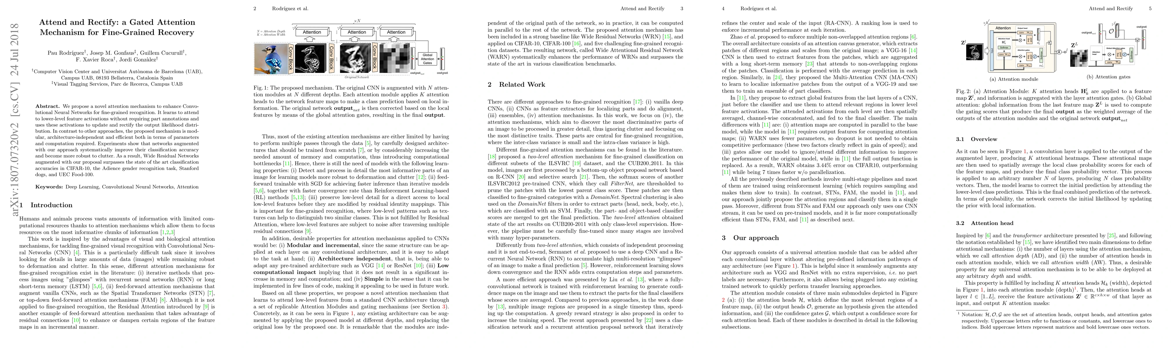 We propose a novel attention mechanism to enhance Convolutional Neural Networks for fine-grained recognition. It learns to attend to lower-level feature activations without requiring part annotations and uses these activations to update and rectify the output likelihood distribution. In contrast to other approaches, the proposed mechanism is modular, architecture-independent and efficient both in terms of parameters and computation required. Experiments show that networks augmented with our approach systematically improve their classification accuracy and become more robust to clutter. As a result, Wide Residual Networks augmented with our proposal surpasses the state of the art classification accuracies in CIFAR-10, the Adience gender recognition task, Stanford dogs, and UEC Food-100.