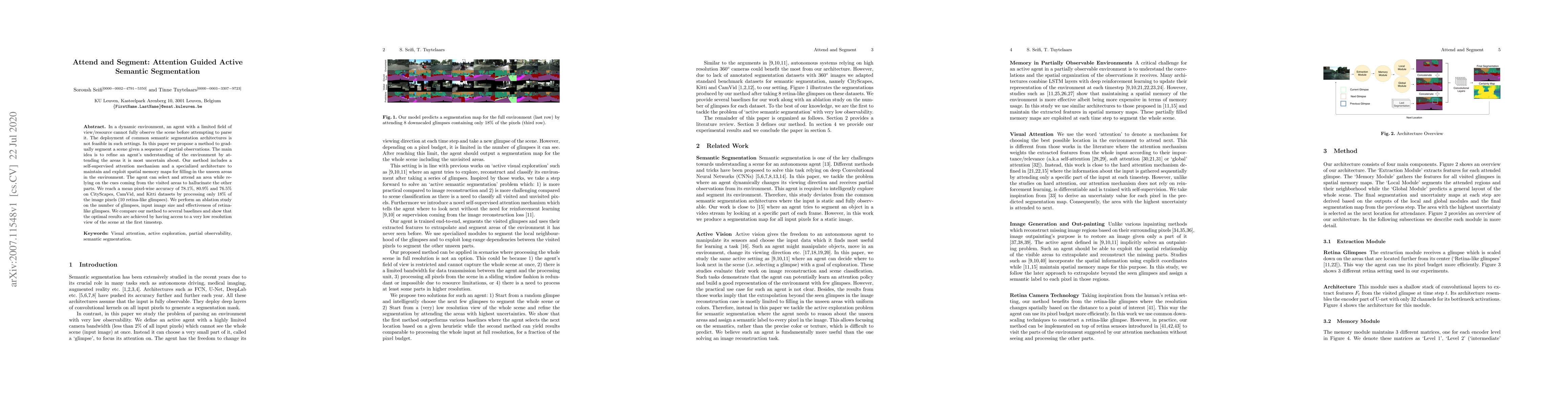 In a dynamic environment, an agent with a limited field of view/resource cannot fully observe the scene before attempting to parse it. The deployment of common semantic segmentation architectures is not feasible in such settings. In this paper we propose a method to gradually segment a scene given a sequence of partial observations. The main idea is to refine an agent's understanding of the environment by attending the areas it is most uncertain about. Our method includes a self-supervised attention mechanism and a specialized architecture to maintain and exploit spatial memory maps for filling-in the unseen areas in the environment. The agent can select and attend an area while relying on the cues coming from the visited areas to hallucinate the other parts. We reach a mean pixel-wise accuracy of 78.1%, 80.9% and 76.5% on CityScapes, CamVid, and Kitti datasets by processing only 18% of the image pixels (10 retina-like glimpses). We perform an ablation study on the number of glimpses, input image size and effectiveness of retina-like glimpses. We compare our method to several baselines and show that the optimal results are achieved by having access to a very low resolution view of the scene at the first timestep.