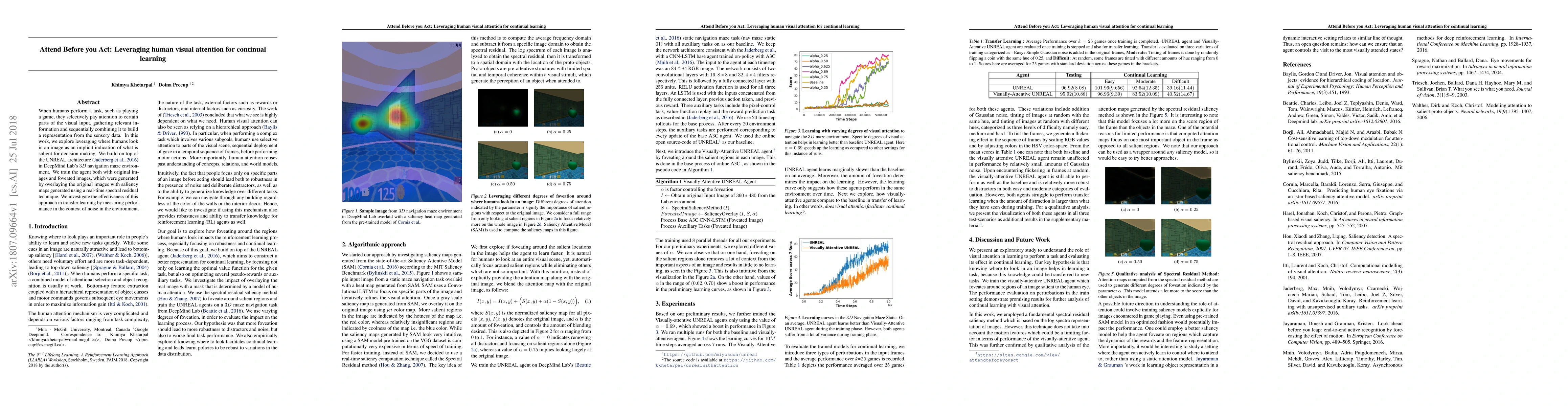When humans perform a task, such as playing a game, they selectively pay attention to certain parts of the visual input, gathering relevant information and sequentially combining it to build a representation from the sensory data. In this work, we explore leveraging where humans look in an image as an implicit indication of what is salient for decision making. We build on top of the UNREAL architecture in DeepMind Lab's 3D navigation maze environment. We train the agent both with original images and foveated images, which were generated by overlaying the original images with saliency maps generated using a real-time spectral residual technique. We investigate the effectiveness of this approach in transfer learning by measuring performance in the context of noise in the environment.