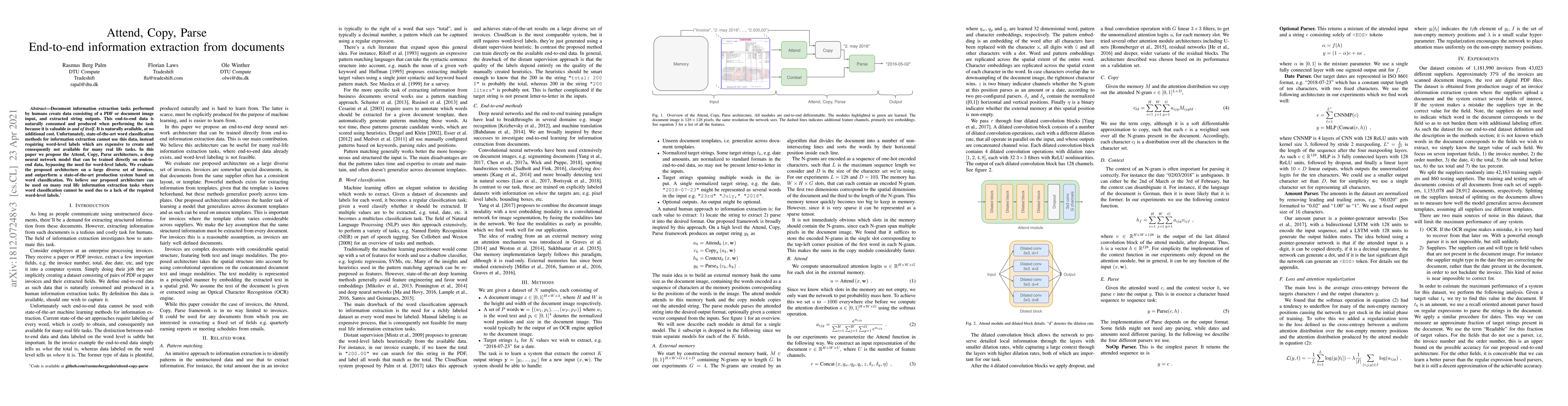 The paper introduces the Attend, Copy, Parse architecture, a deep neural network model for end-to-end information extraction from documents without the need for word-level labels.