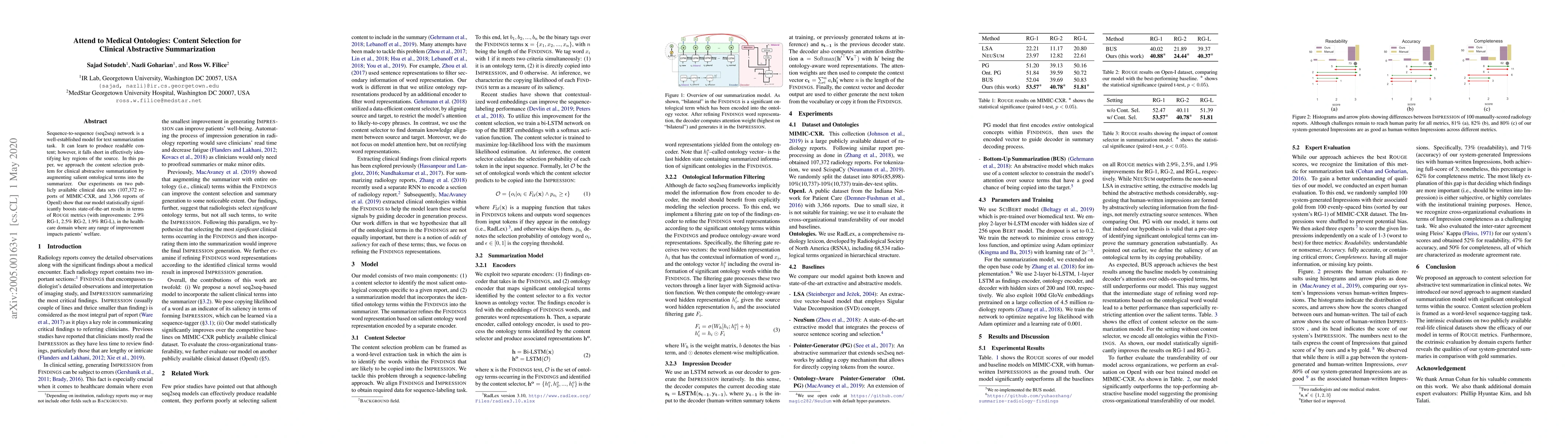 Sequence-to-sequence (seq2seq) network is a well-established model for text summarization task. It can learn to produce readable content; however, it falls short in effectively identifying key regions of the source. In this paper, we approach the content selection problem for clinical abstractive summarization by augmenting salient ontological terms into the summarizer. Our experiments on two publicly available clinical data sets (107,372 reports of MIMIC-CXR, and 3,366 reports of OpenI) show that our model statistically significantly boosts state-of-the-art results in terms of Rouge metrics (with improvements: 2.9% RG-1, 2.5% RG-2, 1.9% RG-L), in the healthcare domain where any range of improvement impacts patients' welfare.