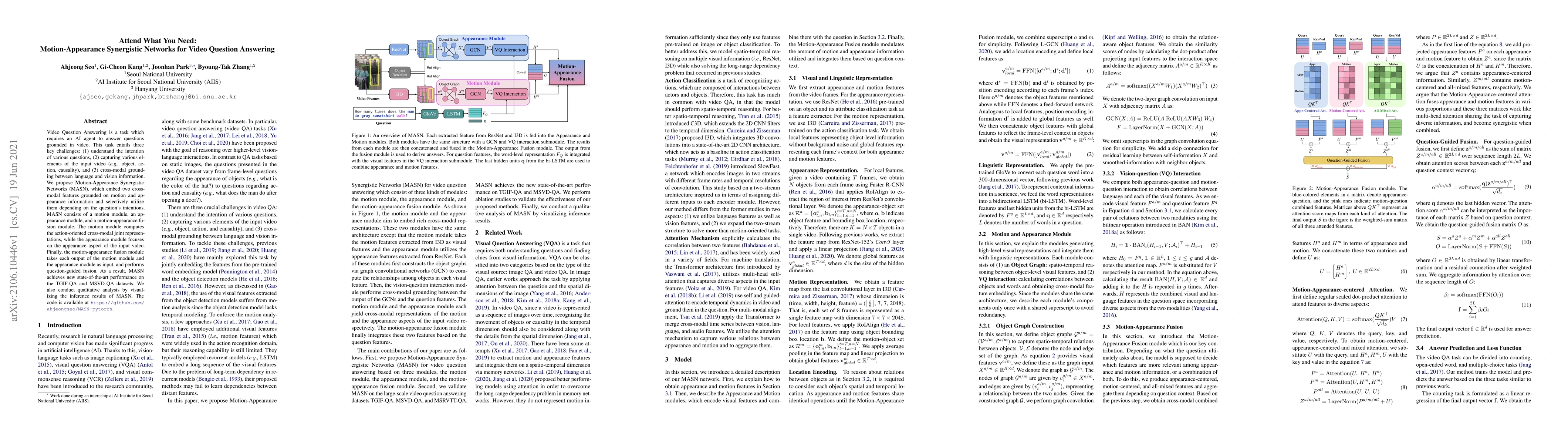 The paper proposes Motion-Appearance Synergistic Networks (MASN) for video question answering, addressing challenges in understanding questions, capturing video elements, and cross-modal grounding. MASN selectively uses motion and appearance features based on question intent, achieving state-of-the-art performance on TGIF-QA and MSVD-QA datasets.