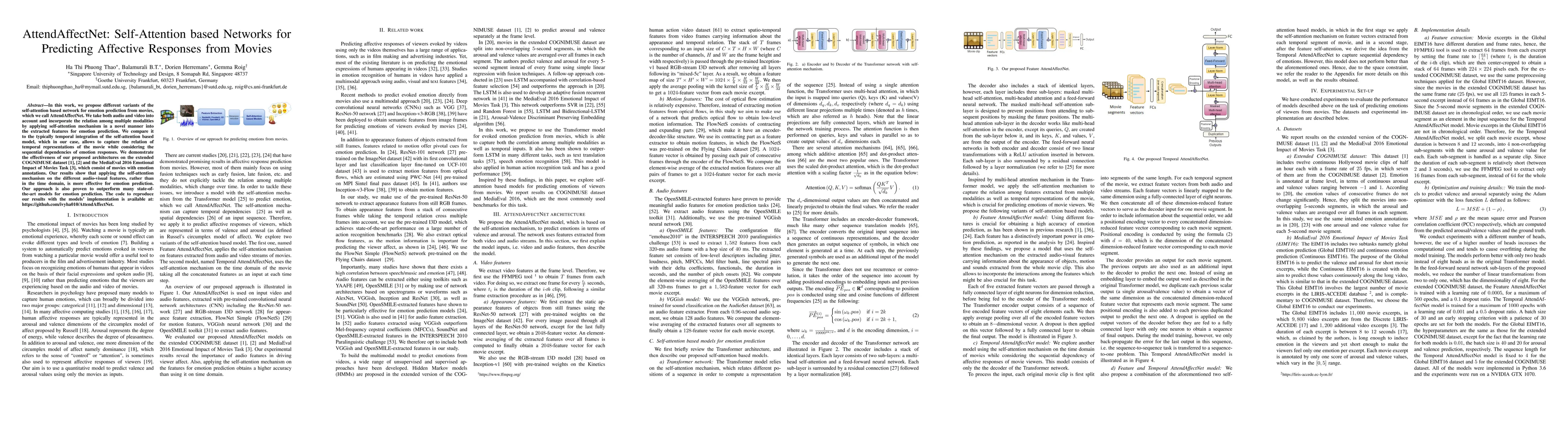 AttendAffectNet proposes self-attention based networks for predicting emotions from movies by integrating audio and video features, showing improved performance over traditional temporal integration methods. The approach outperforms state-of-the-art models on emotion prediction tasks using datasets with annotated movie emotions.