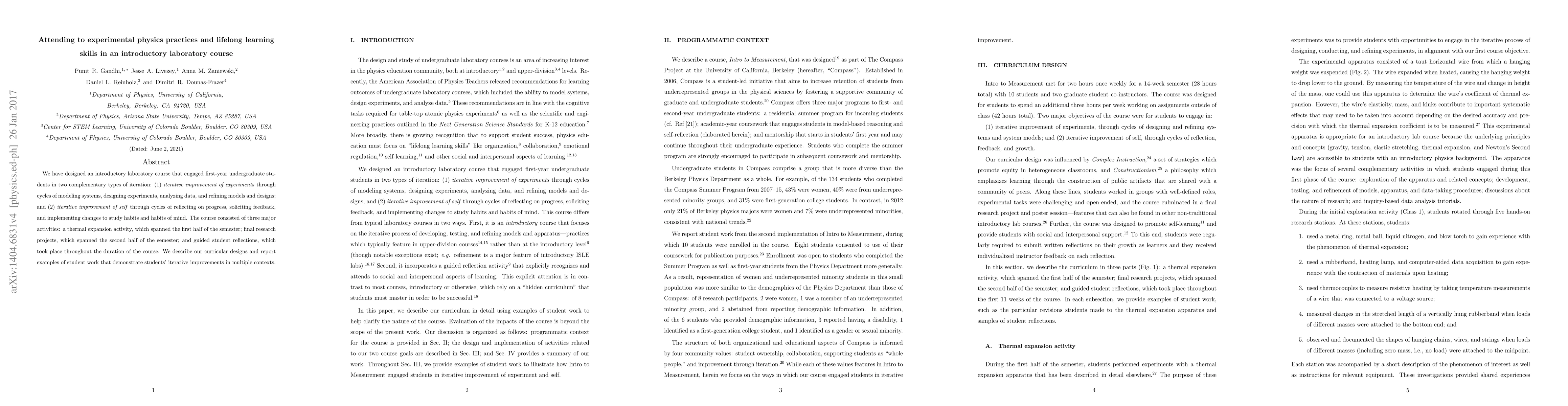 This paper details an innovative introductory laboratory course aimed at enhancing both experimental physics skills and lifelong learning through iterative improvements in both experimental practices and self-reflection. The course included activities like thermal expansion experiments and final research projects, along with guided reflections, fostering iterative progress in both scientific and personal development.