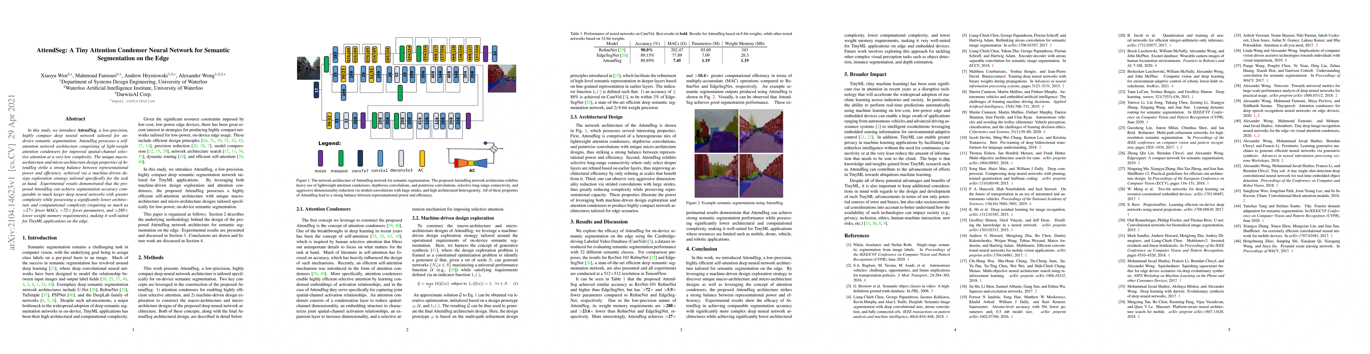 AttendSeg is a compact, low-precision neural network designed for on-device semantic segmentation, featuring lightweight attention condensers for efficient spatial-channel attention. It achieves high accuracy comparable to larger networks while significantly reducing computational complexity, making it ideal for TinyML applications on edge devices.