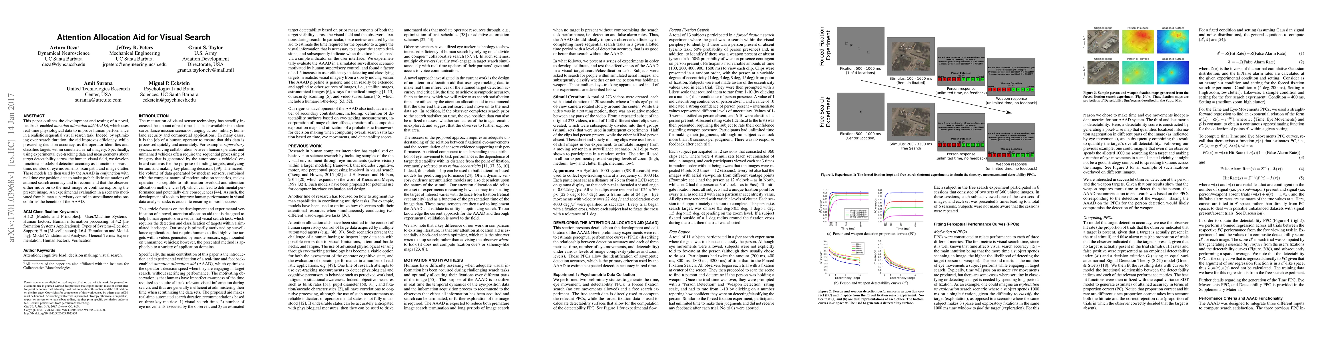 This paper outlines the development and testing of a novel, feedback-enabled attention allocation aid (AAAD), which uses real-time physiological data to improve human performance in a realistic sequential visual search task. Indeed, by optimizing over search duration, the aid improves efficiency, while preserving decision accuracy, as the operator identifies and classifies targets within simulated aerial imagery. Specifically, using experimental eye-tracking data and measurements about target detectability across the human visual field, we develop functional models of detection accuracy as a function of search time, number of eye movements, scan path, and image clutter. These models are then used by the AAAD in conjunction with real time eye position data to make probabilistic estimations of attained search accuracy and to recommend that the observer either move on to the next image or continue exploring the present image. An experimental evaluation in a scenario motivated from human supervisory control in surveillance missions confirms the benefits of the AAAD.