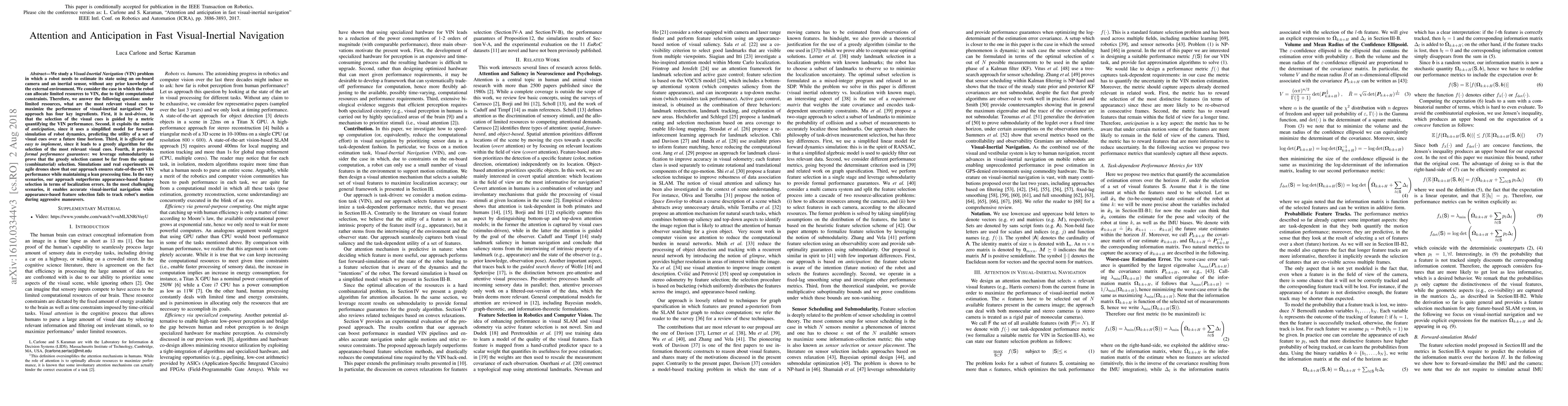 This paper proposes a method for Visual-Inertial Navigation under computational constraints, focusing on selecting the most relevant visual cues to maximize performance. It employs a task-driven, anticipation-based, efficient algorithm with formal performance guarantees, achieving state-of-the-art results in both simulations and real-world drone experiments.