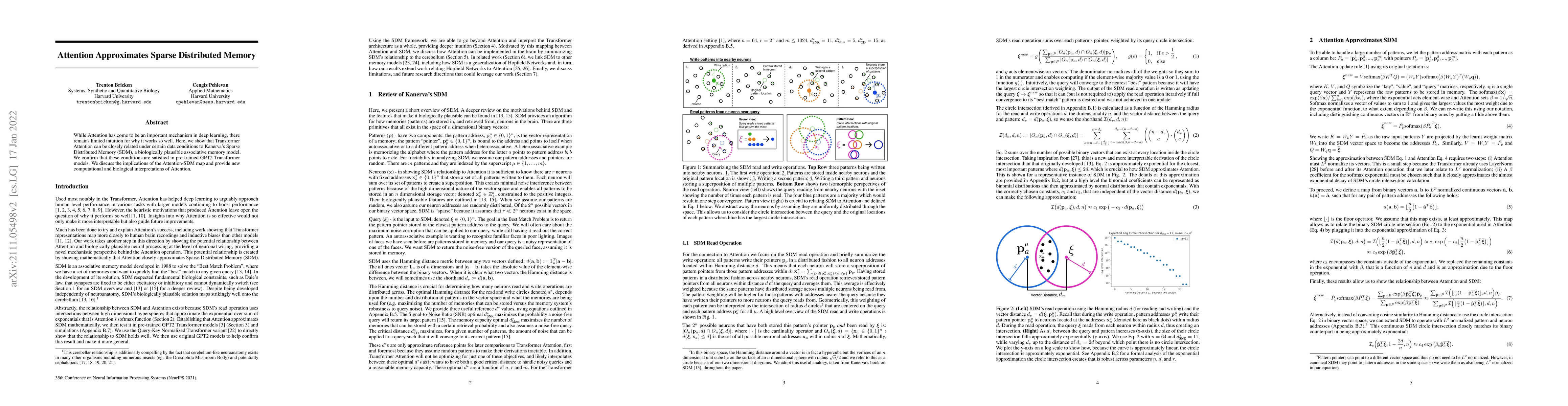 This paper demonstrates that Transformer Attention under specific data conditions approximates Kanerva's Sparse Distributed Memory (SDM), offering new computational and biological insights into why Attention mechanisms work well. The study confirms these conditions in pre-trained GPT2 models, highlighting the implications for both deep learning and cognitive modeling.