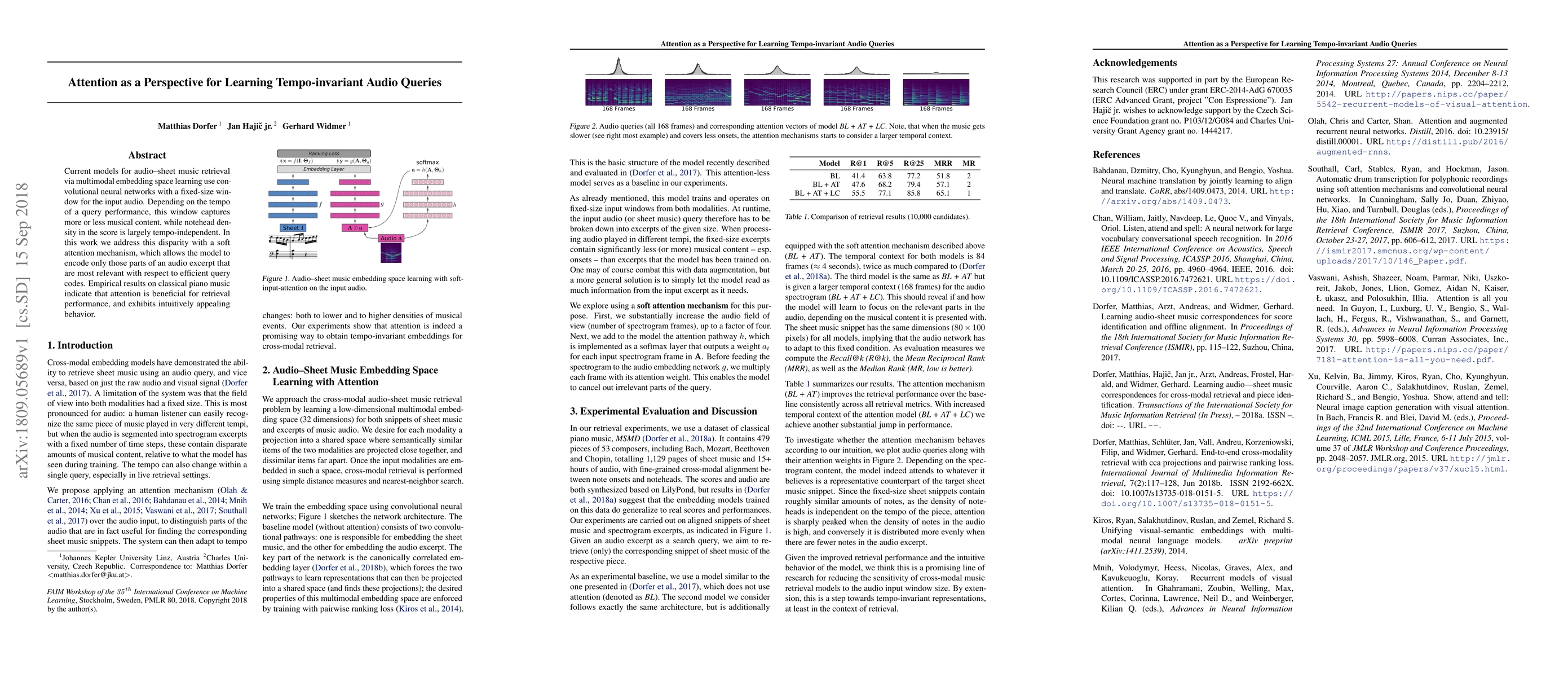 This paper proposes using a soft attention mechanism to improve the retrieval of tempo-invariant audio queries in multimodal embedding space learning, addressing the issue of varying musical content captured by fixed-size windows. Empirical results show that attention enhances retrieval performance and aligns with intuitive expectations.