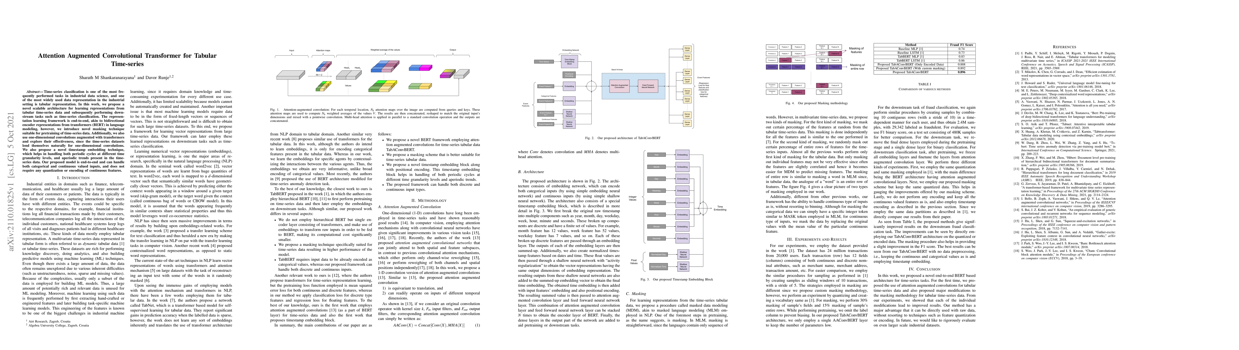 Time-series classification is one of the most frequently performed tasks in industrial data science, and one of the most widely used data representation in the industrial setting is tabular representation. In this work, we propose a novel scalable architecture for learning representations from tabular time-series data and subsequently performing downstream tasks such as time-series classification. The representation learning framework is end-to-end, akin to bidirectional encoder representations from transformers (BERT) in language modeling, however, we introduce novel masking technique suitable for pretraining of time-series data. Additionally, we also use one-dimensional convolutions augmented with transformers and explore their effectiveness, since the time-series datasets lend themselves naturally for one-dimensional convolutions. We also propose a novel timestamp embedding technique, which helps in handling both periodic cycles at different time granularity levels, and aperiodic trends present in the time-series data. Our proposed model is end-to-end and can handle both categorical and continuous valued inputs, and does not require any quantization or encoding of continuous features.