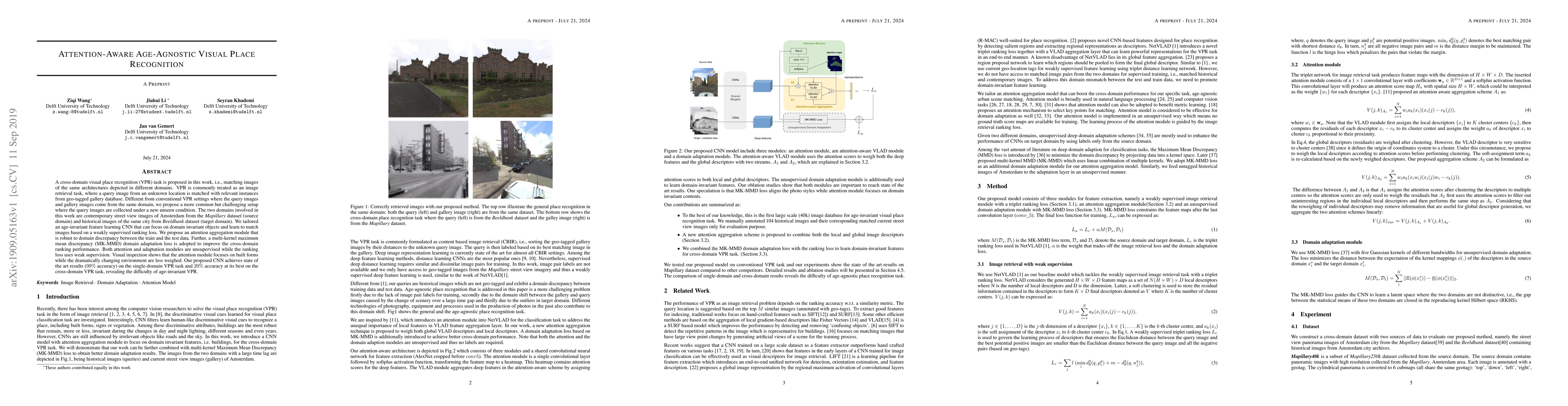 This paper introduces a novel cross-domain visual place recognition (VPR) approach that matches images of the same architectural structures across different domains. The method employs an age-invariant CNN with an attention aggregation module and a multi-kernel maximum mean discrepancy (MK-MMD) domain adaptation loss to handle the domain discrepancy between contemporary and historical images of Amsterdam. The proposed model achieves state-of-the-art results in single-domain VPR and demonstrates the challenges of cross-domain, age-agnostic VPR.