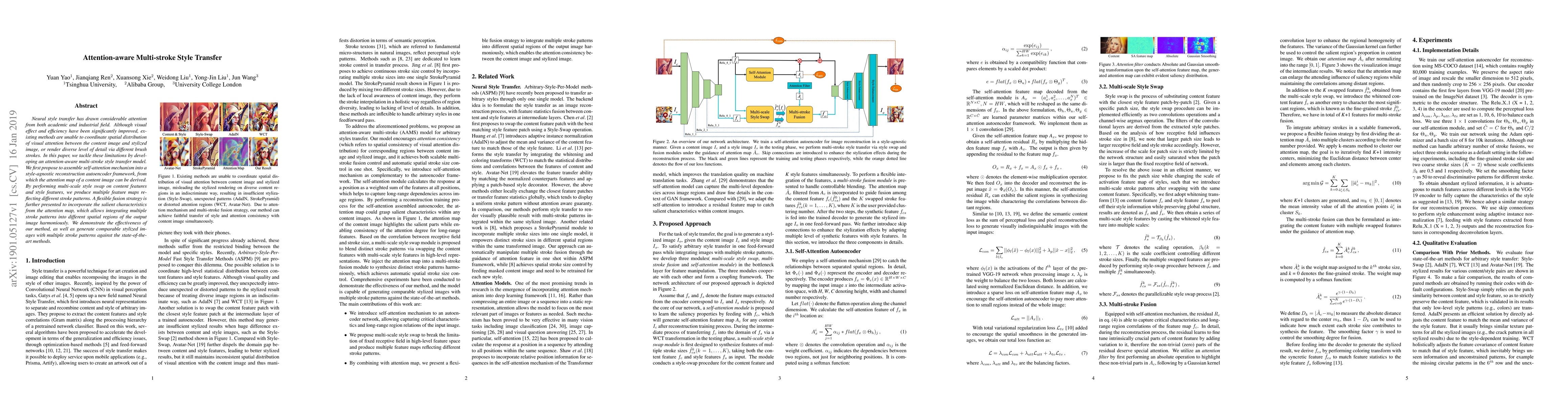 This paper introduces an attention-aware multi-stroke style transfer model that integrates self-attention mechanisms into a reconstruction autoencoder to coordinate visual attention between content and stylized images. The method employs multi-scale style swap and a flexible fusion strategy to harmonize diverse stroke patterns across different spatial regions.