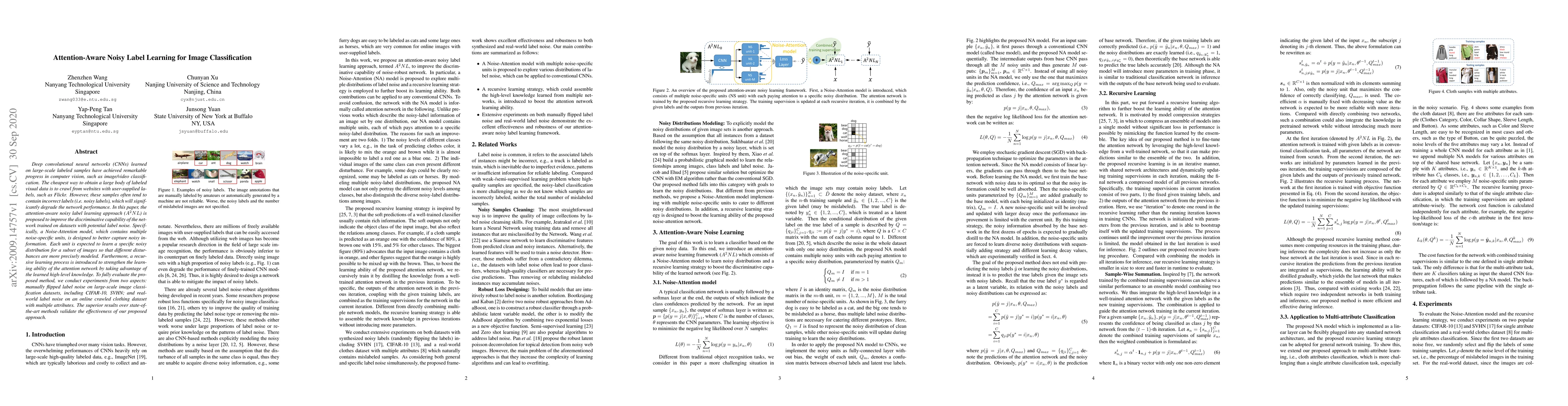 Deep convolutional neural networks (CNNs) learned on large-scale labeled samples have achieved remarkable progress in computer vision, such as image/video classification. The cheapest way to obtain a large body of labeled visual data is to crawl from websites with user-supplied labels, such as Flickr. However, these samples often tend to contain incorrect labels (i.e. noisy labels), which will significantly degrade the network performance. In this paper, the attention-aware noisy label learning approach ($A^2NL$) is proposed to improve the discriminative capability of the network trained on datasets with potential label noise. Specifically, a Noise-Attention model, which contains multiple noise-specific units, is designed to better capture noisy information. Each unit is expected to learn a specific noisy distribution for a subset of images so that different disturbances are more precisely modeled. Furthermore, a recursive learning process is introduced to strengthen the learning ability of the attention network by taking advantage of the learned high-level knowledge. To fully evaluate the proposed method, we conduct experiments from two aspects: manually flipped label noise on large-scale image classification datasets, including CIFAR-10, SVHN; and real-world label noise on an online crawled clothing dataset with multiple attributes. The superior results over state-of-the-art methods validate the effectiveness of our proposed approach.