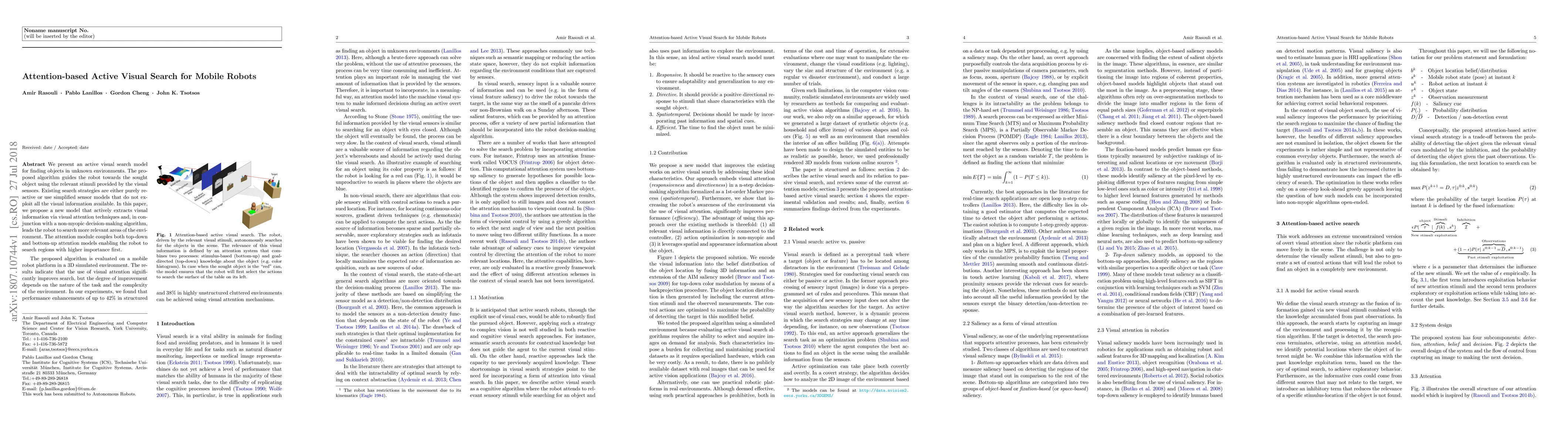 This paper introduces an active visual search model for mobile robots using attention-based techniques to find objects in unknown environments. The proposed algorithm enhances search efficiency by prioritizing relevant areas, leading to performance improvements up to 42% in structured and 38% in cluttered environments.