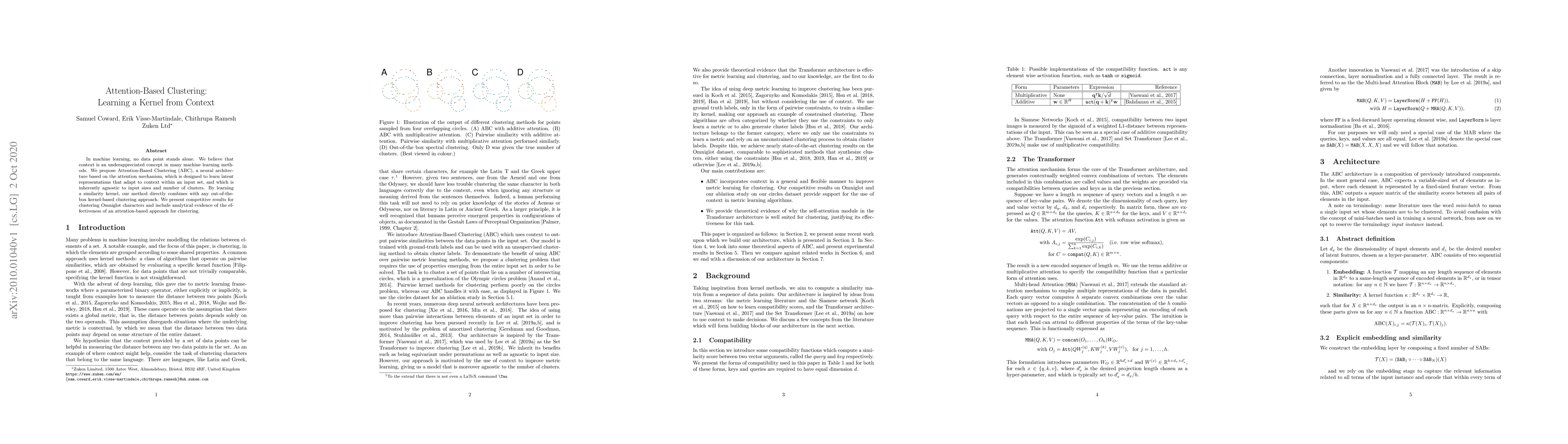 In machine learning, no data point stands alone. We believe that context is an underappreciated concept in many machine learning methods. We propose Attention-Based Clustering (ABC), a neural architecture based on the attention mechanism, which is designed to learn latent representations that adapt to context within an input set, and which is inherently agnostic to input sizes and number of clusters. By learning a similarity kernel, our method directly combines with any out-of-the-box kernel-based clustering approach. We present competitive results for clustering Omniglot characters and include analytical evidence of the effectiveness of an attention-based approach for clustering.