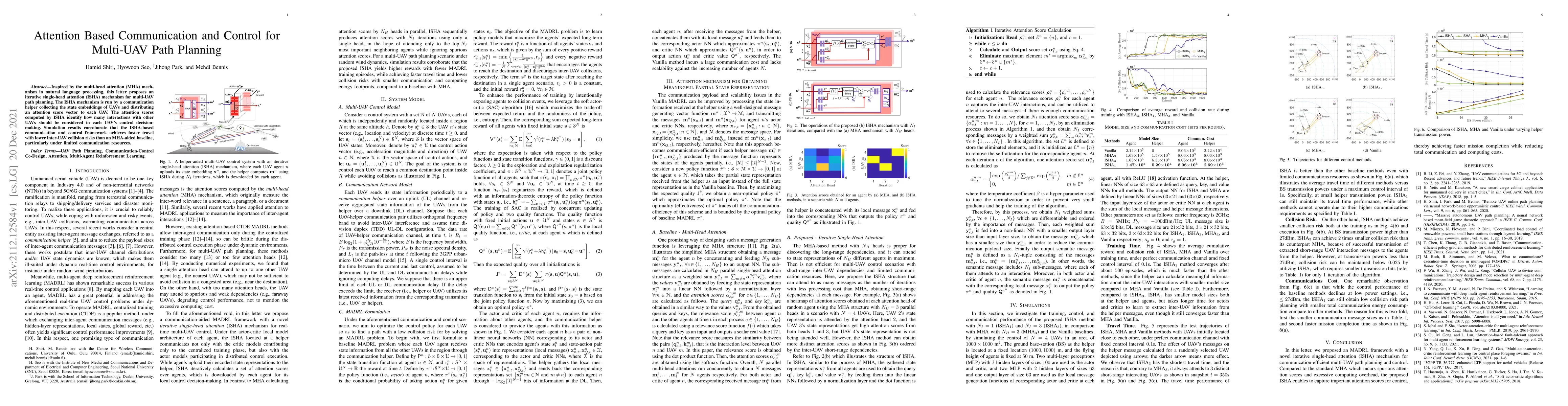 Inspired by the multi-head attention (MHA) mechanism in natural language processing, this letter proposes an iterative single-head attention (ISHA) mechanism for multi-UAV path planning. The ISHA mechanism is run by a communication helper collecting the state embeddings of UAVs and distributing an attention score vector to each UAV. The attention scores computed by ISHA identify how many interactions with other UAVs should be considered in each UAV's control decision-making. Simulation results corroborate that the ISHA-based communication and control framework achieves faster travel with lower inter-UAV collision risks than an MHA-aided baseline, particularly under limited communication resources.