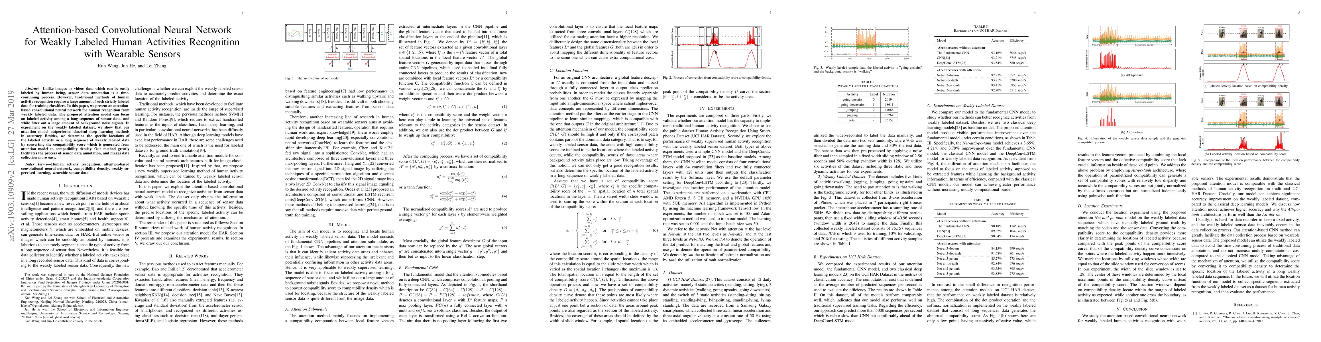 This paper proposes an attention-based convolutional neural network to recognize human activities from weakly labeled data collected by wearable sensors. The attention model enhances accuracy by focusing on labeled activities and filtering background noise, significantly improving over traditional deep learning methods.