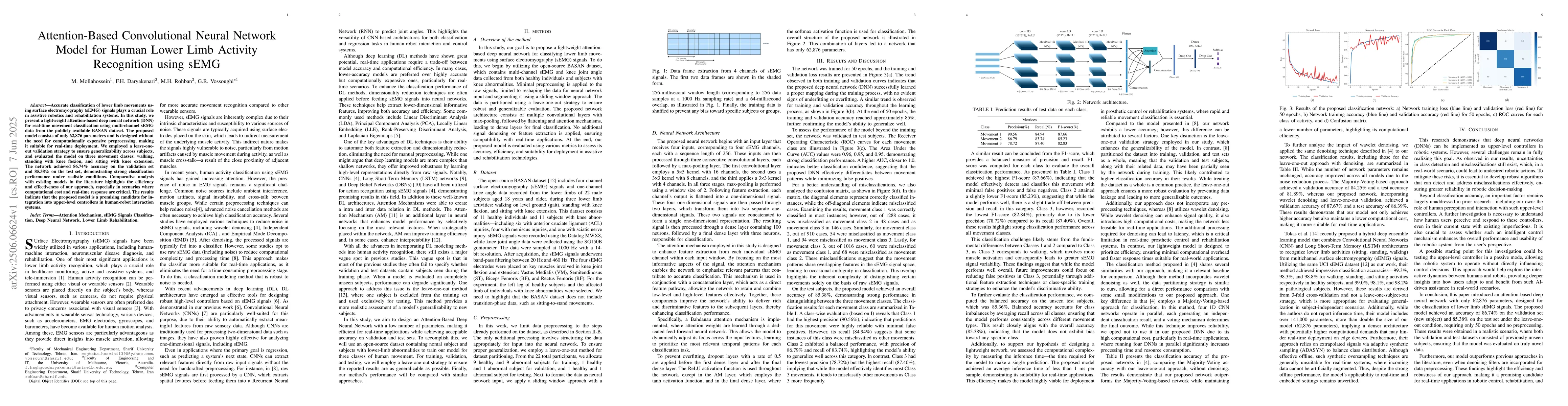Accurate classification of lower limb movements using surface electromyography (sEMG) signals plays a crucial role in assistive robotics and rehabilitation systems. In this study, we present a lightweight attention-based deep neural network (DNN) for real-time movement classification using multi-channel sEMG data from the publicly available BASAN dataset. The proposed model consists of only 62,876 parameters and is designed without the need for computationally expensive preprocessing, making it suitable for real-time deployment. We employed a leave-oneout validation strategy to ensure generalizability across subjects, and evaluated the model on three movement classes: walking, standing with knee flexion, and sitting with knee extension. The network achieved 86.74% accuracy on the validation set and 85.38% on the test set, demonstrating strong classification performance under realistic conditions. Comparative analysis with existing models in the literature highlights the efficiency and effectiveness of our approach, especially in scenarios where computational cost and real-time response are critical. The results indicate that the proposed model is a promising candidate for integration into upper-level controllers in human-robot interaction systems.