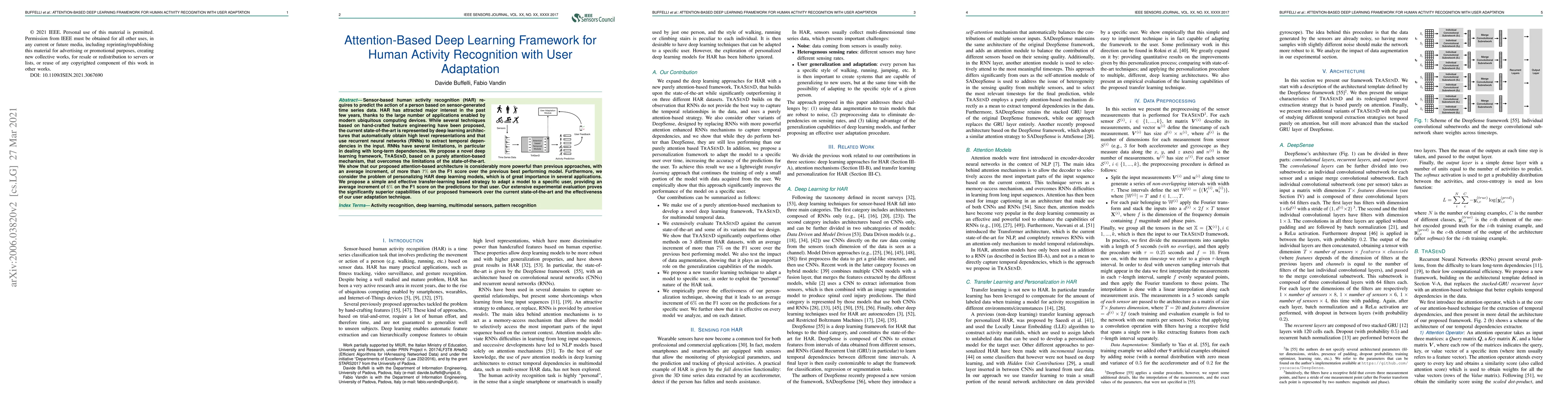 This paper proposes an attention-based deep learning framework for human activity recognition (HAR) that outperforms previous RNN-based models by over 7% in F1 score. It also introduces a user adaptation technique using transfer learning, which further improves HAR accuracy by 6% for specific users.