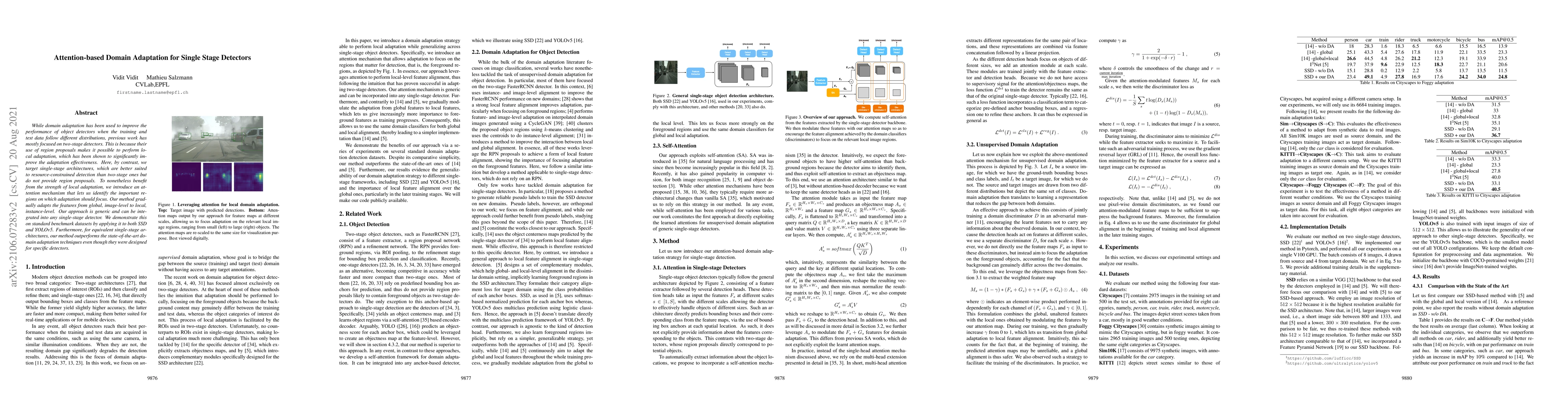 While domain adaptation has been used to improve the performance of object detectors when the training and test data follow different distributions, previous work has mostly focused on two-stage detectors. This is because their use of region proposals makes it possible to perform local adaptation, which has been shown to significantly improve the adaptation effectiveness. Here, by contrast, we target single-stage architectures, which are better suited to resource-constrained detection than two-stage ones but do not provide region proposals. To nonetheless benefit from the strength of local adaptation, we introduce an attention mechanism that lets us identify the important regions on which adaptation should focus. Our method gradually adapts the features from global, image-level to local, instance-level. Our approach is generic and can be integrated into any single-stage detector. We demonstrate this on standard benchmark datasets by applying it to both SSD and YOLOv5. Furthermore, for equivalent single-stage architectures, our method outperforms the state-of-the-art domain adaptation techniques even though they were designed for specific detectors.
