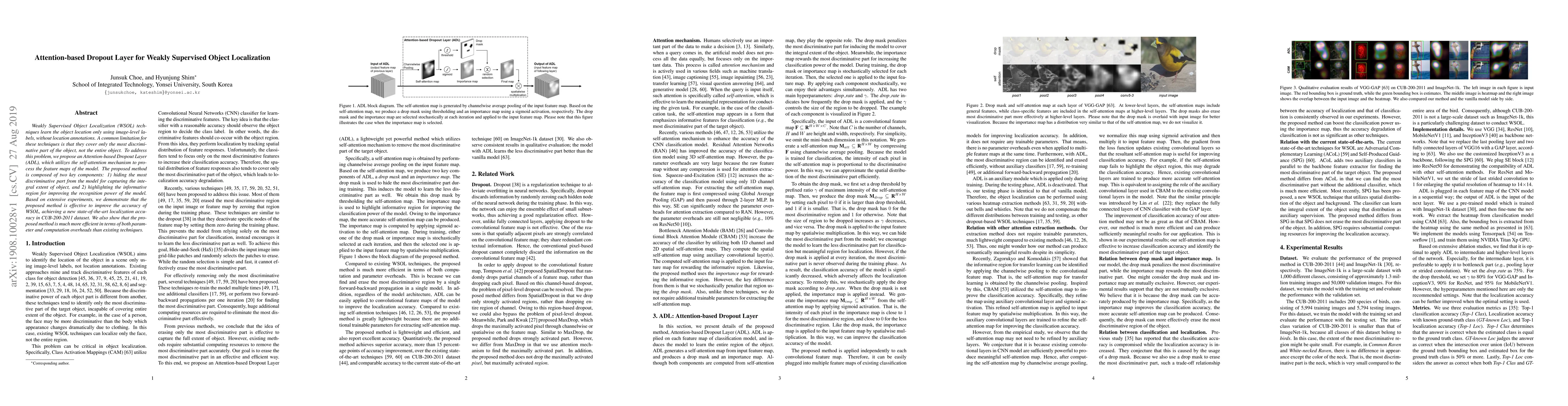 This paper proposes an Attention-based Dropout Layer (ADL) to enhance weakly supervised object localization by utilizing self-attention to capture both the most discriminative parts and the full extent of objects. The method achieves better localization accuracy and efficiency compared to existing techniques.