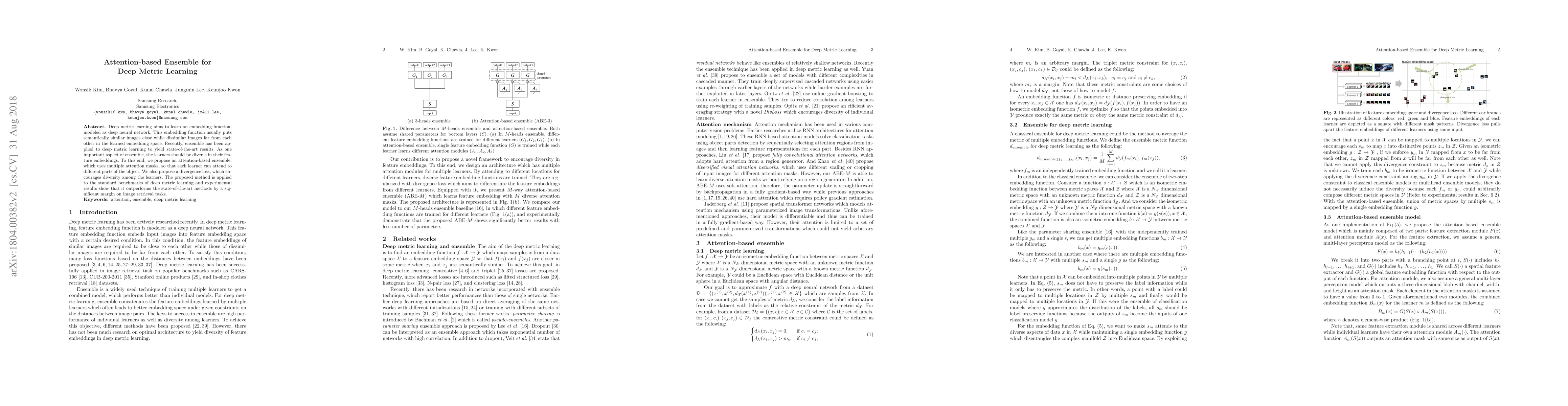 This paper proposes an attention-based ensemble method for deep metric learning that utilizes multiple attention masks to ensure diverse feature embeddings among learners. It employs a divergence loss to encourage learner diversity, achieving superior performance on image retrieval benchmarks compared to state-of-the-art methods.