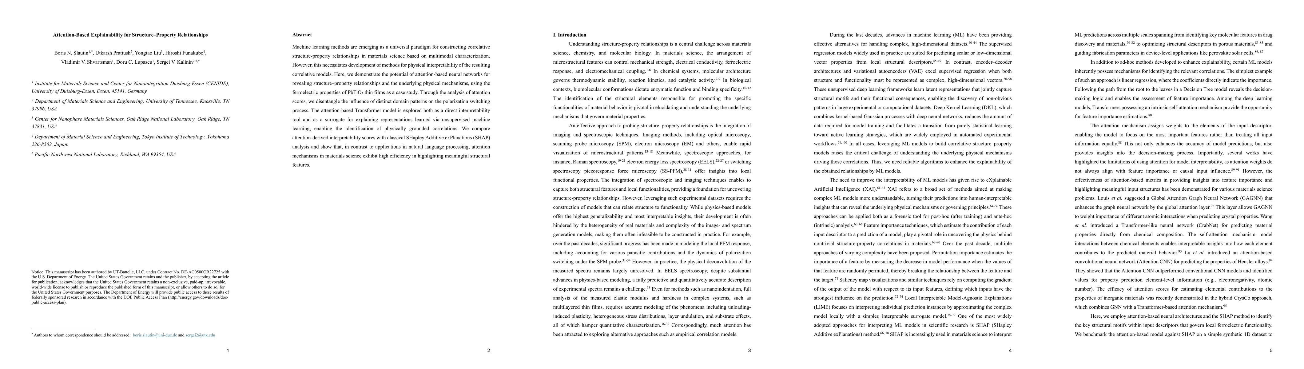 Machine learning methods are emerging as a universal paradigm for constructing correlative structure-property relationships in materials science based on multimodal characterization. However, this necessitates development of methods for physical interpretability of the resulting correlative models. Here, we demonstrate the potential of attention-based neural networks for revealing structure-property relationships and the underlying physical mechanisms, using the ferroelectric properties of PbTiO3 thin films as a case study. Through the analysis of attention scores, we disentangle the influence of distinct domain patterns on the polarization switching process. The attention-based Transformer model is explored both as a direct interpretability tool and as a surrogate for explaining representations learned via unsupervised machine learning, enabling the identification of physically grounded correlations. We compare attention-derived interpretability scores with classical SHapley Additive exPlanations (SHAP) analysis and show that, in contrast to applications in natural language processing, attention mechanisms in materials science exhibit high efficiency in highlighting meaningful structural features.