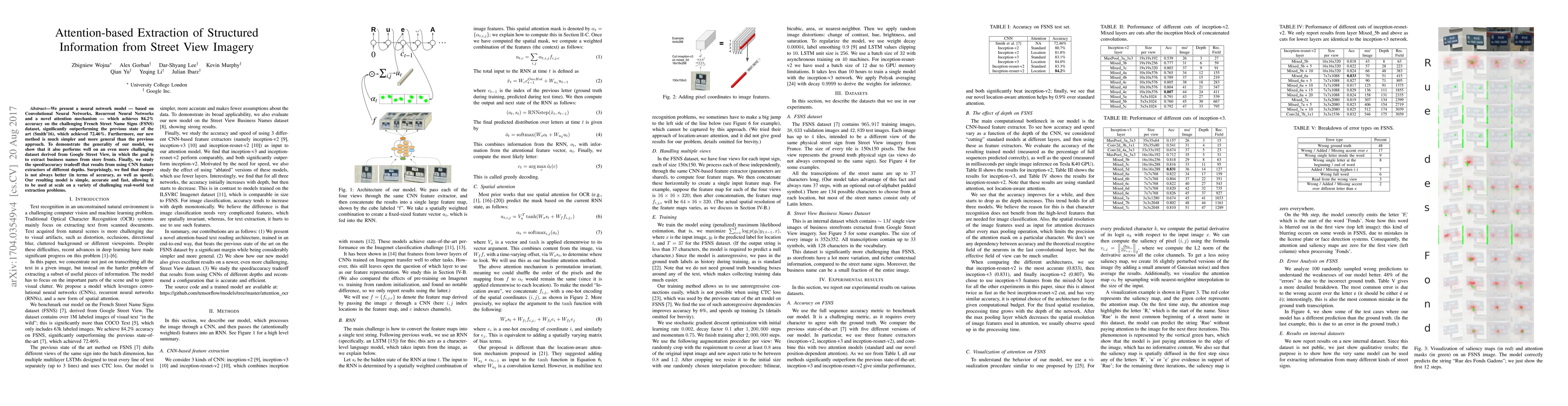 This research introduces a neural network model combining CNNs, RNNs, and an innovative attention mechanism to extract structured information from street view imagery. The model achieves 84.2% accuracy on the French Street Name Signs dataset, surpassing the previous state-of-the-art, and demonstrates effectiveness on a more challenging dataset for extracting business names. The study also explores the trade-off between model depth, speed, and accuracy, revealing that deeper networks do not always yield better results.