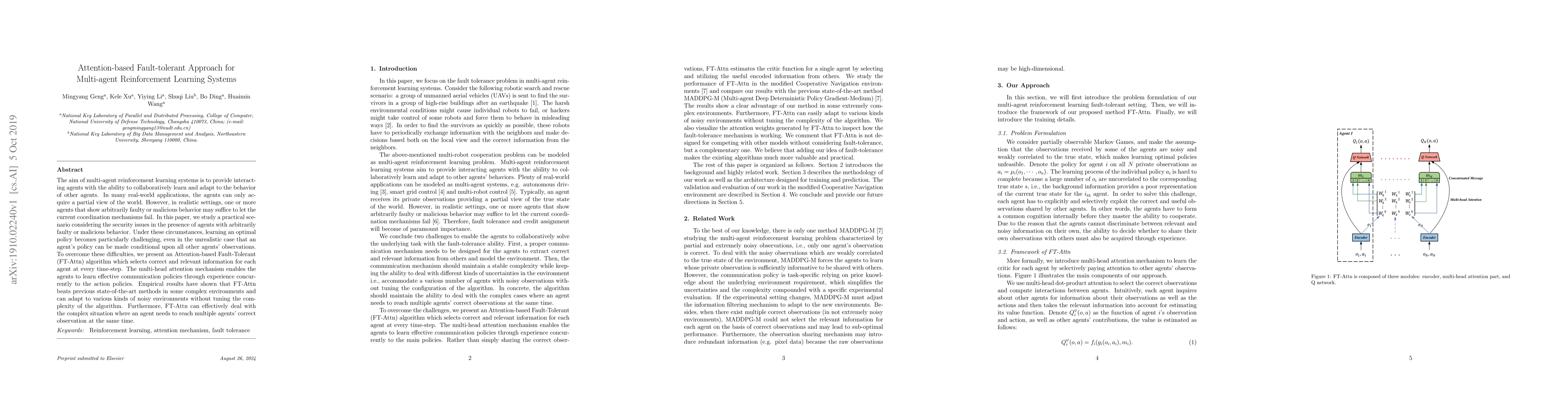 This paper proposes an Attention-based Fault-Tolerant (FT-Attn) algorithm for multi-agent reinforcement learning systems to handle faulty or malicious agents. The FT-Attn algorithm uses a multi-head attention mechanism to select relevant information, enabling effective communication and adaptation in complex, noisy environments.