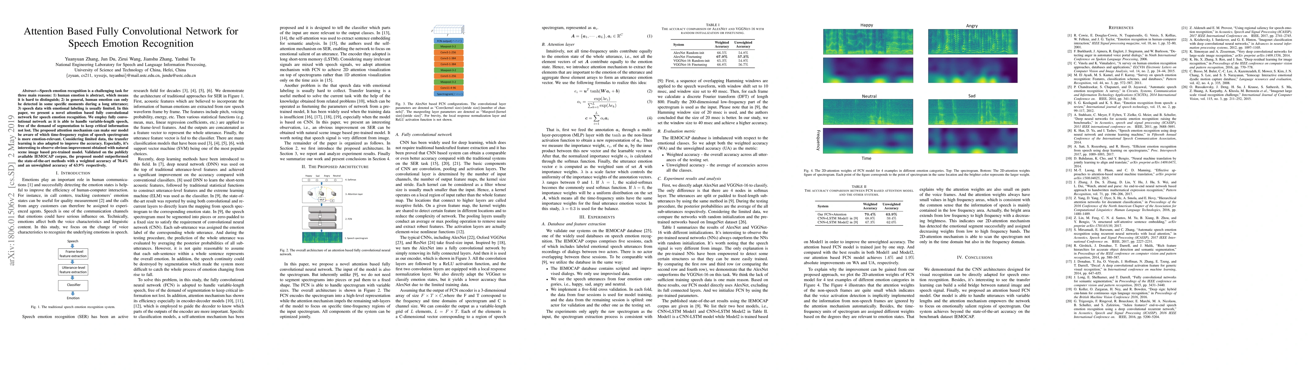 This paper introduces an attention-based fully convolutional network for speech emotion recognition, addressing the challenges of abstract emotion detection, temporal specificity, and limited labeled data. The model leverages transfer learning and achieves superior performance on the IEMOCAP dataset, outperforming existing methods with 70.4% weighted and 63.9% unweighted accuracy.