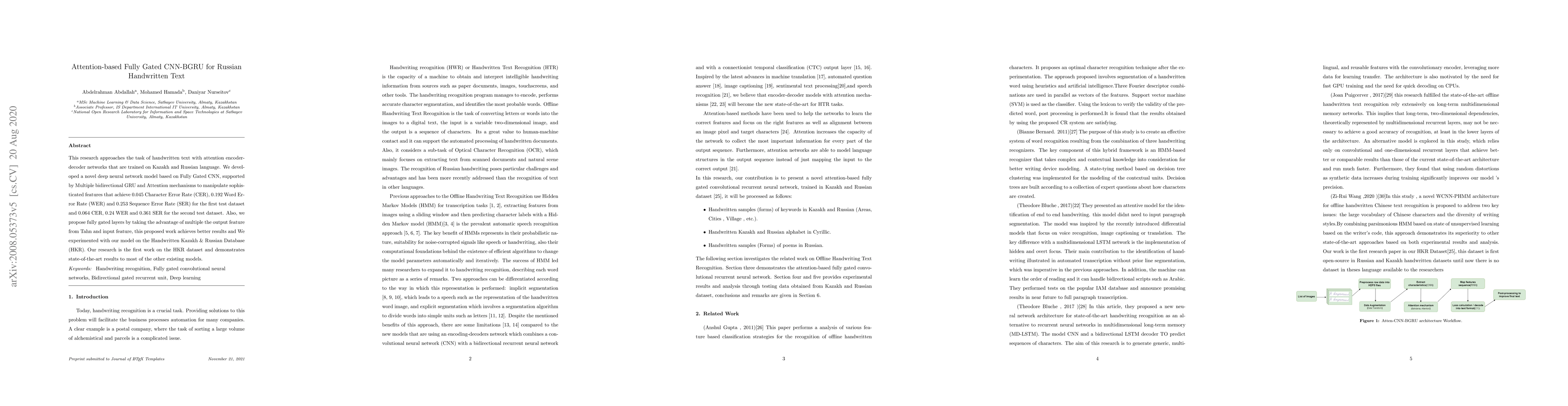This study introduces a novel deep neural network combining Fully Gated CNN, bidirectional GRU, and attention mechanisms to achieve state-of-the-art performance in recognizing Kazakh and Russian handwritten text, achieving low error rates on the Handwritten Kazakh & Russian Database (HKR).