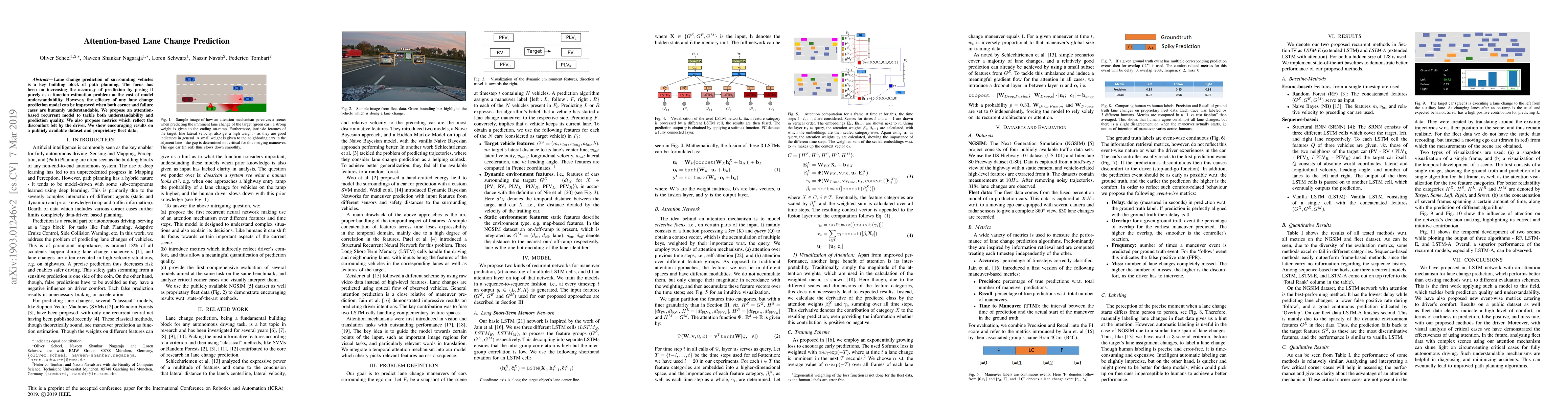 This paper proposes an attention-based recurrent model for lane change prediction that aims to improve both accuracy and model understandability. The model also includes metrics to gauge driver discomfort, demonstrating promising results on both public and proprietary datasets.