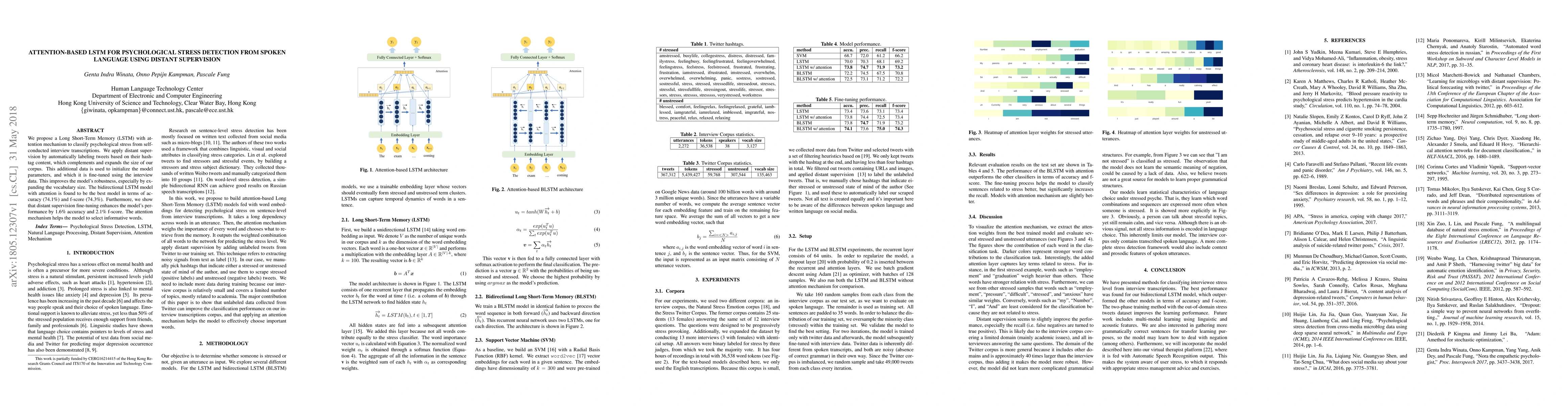 This paper proposes an attention-based LSTM model to classify psychological stress from spoken language in interview transcriptions. Distant supervision via hashtag-based tweet labeling expands the training corpus, enhancing the model's performance by 1.6% accuracy and 2.1% f-score. The bidirectional LSTM with attention achieves 74.1% accuracy and 74.3% f-score.