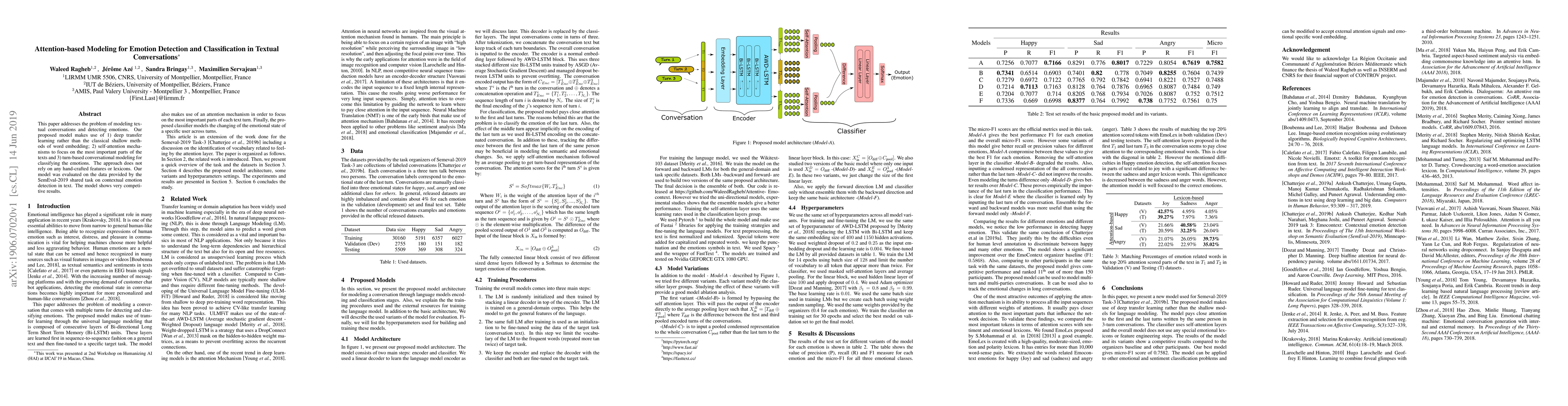 This paper proposes an attention-based model for emotion detection in textual conversations using deep transfer learning and self-attention mechanisms, achieving competitive results on the SemEval-2019 dataset without relying on hand-crafted features.